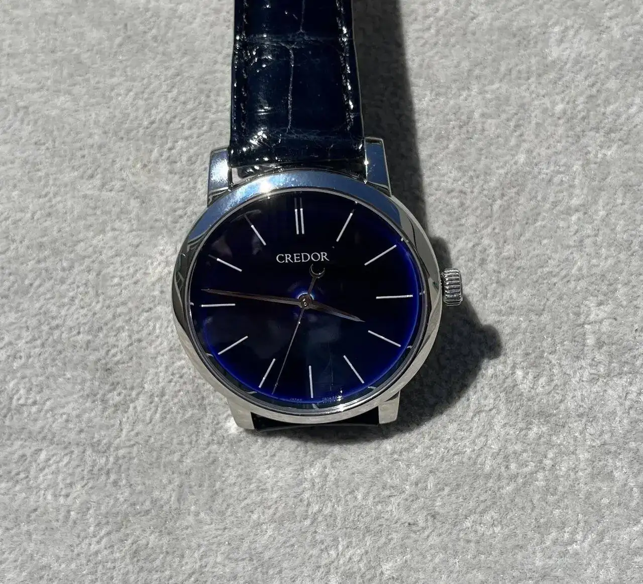 La caja de los Eichi II es de platino 950 y está excepcionalmente pulida en círculos. Tiene unas dimensiones quasi perfectas de 39 mm de diámetro por 10 mm de alto. Y este modelo Ruri presentado con un asombroso dial azul, que te llega a aturdir incluso al mirarlo, es para mí la apoteosis de Credor. Es tan impactante que hace que te olvides instantáneamente de la excepcional caja de platino. Acaparando el dial de porcelana, sutilmente abovedado y pintado de azul a mano durante más de dos años, todo el show. Un azul que los japoneses llaman Ruri, el lapislázuli occidental, y que transmite un efecto degradado que asemeja a un neón en el centro y en los bordes de la esfera. El cual hubiera firmado el mismísimo George Lucas como reloj para sus Jedis en Star Wars (no he podido evitar la frikada…).