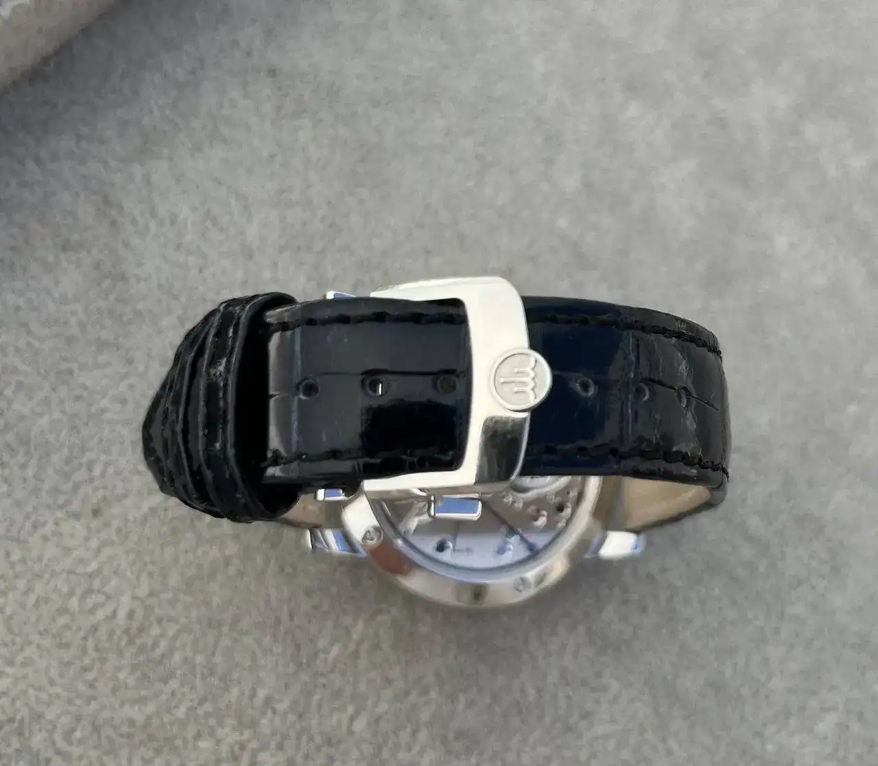 Eso sí, al ser un reloj de vestir la estanqueidad se queda en unos suficientes 30 metros para ciertos percances que pudieran ocurrir. La correa azul de cuero lleva también un triple cierre de platino.