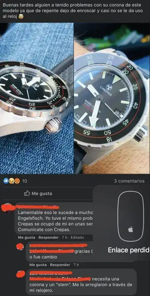 Bueno pues ayer me llegó el Engelsfich reparado con su nueva corona. Ahora se nota el cierre mucho más fuerte y consistente. Si os pasa a alguno más, recomiendo usar el teléfono que pone en el libro de garantía , ya que al email no le prestan tanta atención. Agradecer a los compañeros que me indicaron y aconsejaron y también a CREPAS, que ha tenido de nuevo, una respuesta rápida y eficaz, dejando sensación de marca seria, consolidada y con un servicio técnico muy ágil.Ver el archivos adjunto 879717