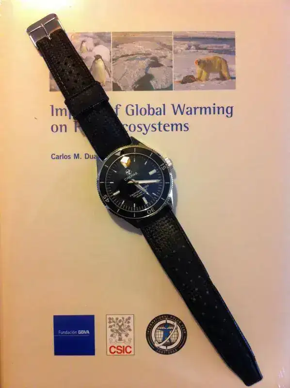 Cons: Tan sólo mencionar aquí la sensación de debilidad que trasmite, tanto el bucle, como la propia correa, debido a su mínimo grosor. Pero tenemos que darnos cuenta que, cuando se fabricaban las Tropic, pocos son los que pensaban en relojes de buceo de 43 mm y casi 2 cm... Lo que me lleva a una reflexión final: ¿por qué no hay ningún fabricante que reflote las correas Tropic, como sucedió con las Isofrane, pero un poco más actualizadas a los relojes que se utilizan ahora? Creo que sería un triunfo seguro.