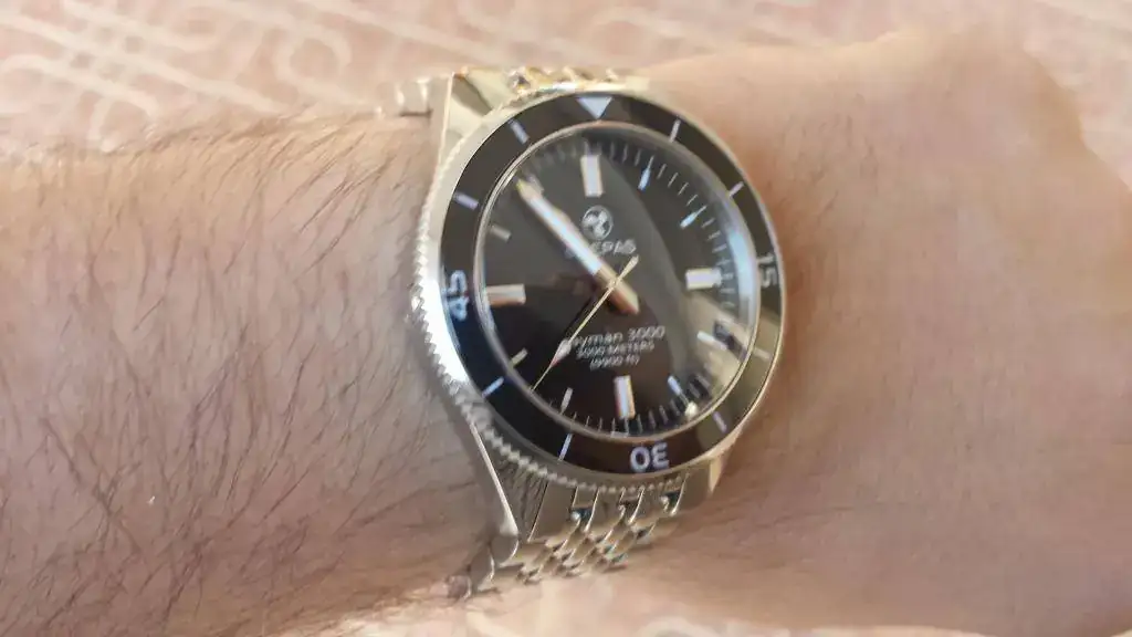 El bisel da la sensacion de no ser ceramico, el armis es completamente cepillado, tiene calendario, el dial y las agujas son similares pero se nota que no son los mismos ni de la misma calidad, el cierre del armis no es de los de mariposa si no de los otros lo que le resta muchisima elegancia al reloj y por lo que he visto en su web (aun no esta disponible) suelen montar Miyotas.