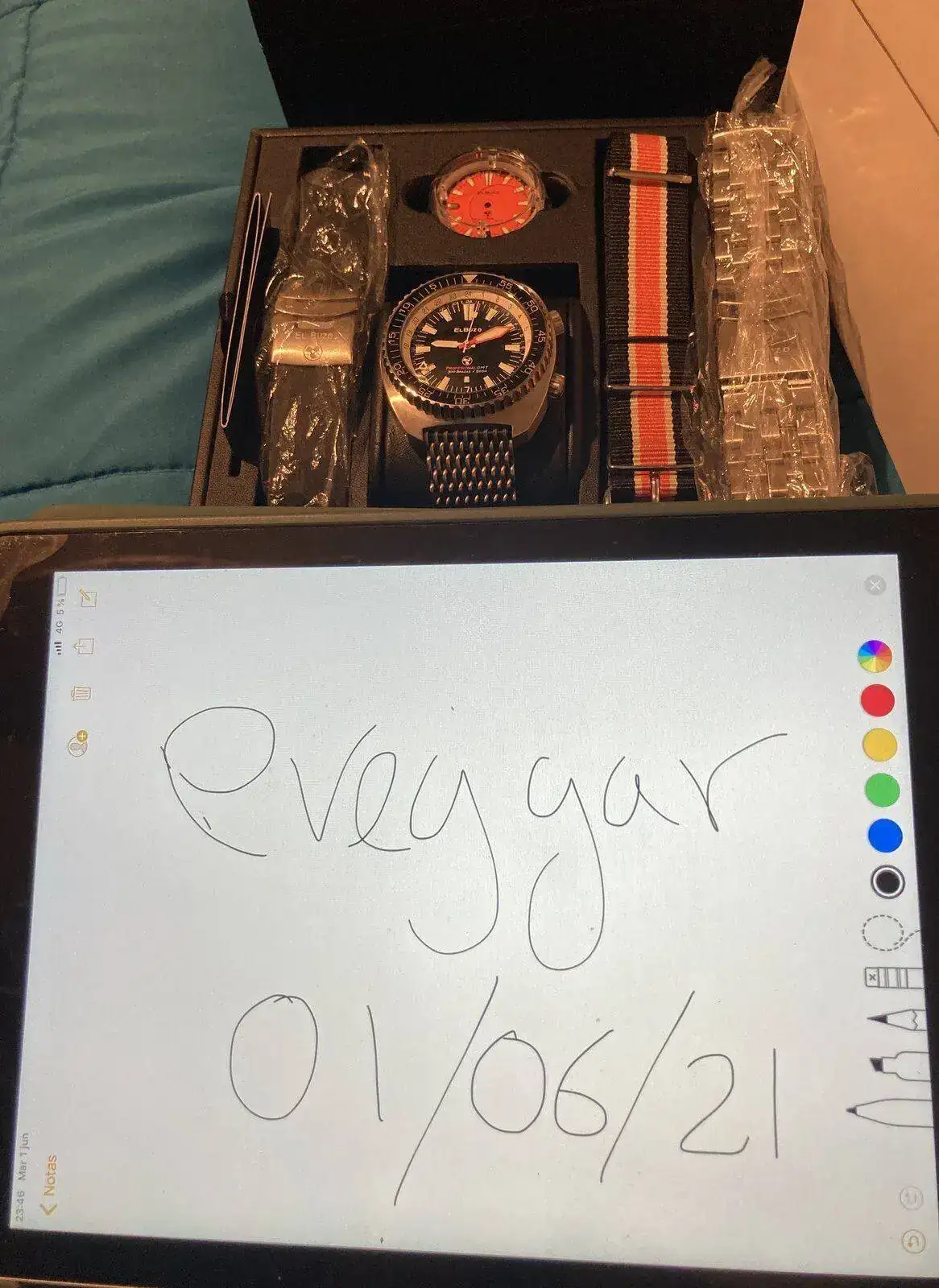 | Esfera: | NEGRA PUESTA AHORA Y UNA DE REPUESTO NARANJA CON SUS AGUJAS. | ||||||