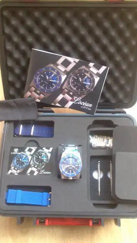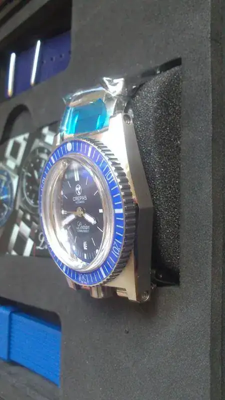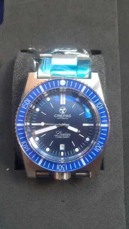 Con mucho pesar pongo a la venta un fabuloso Crepas l'Ocean con esfera azul. Está en un estado de reestreno y dispone de set completo. Como ya sabéis es un diver con las más modernos materiales basado en el francés de los años 60 ZRC. Dispone de válvula de helio a las 12 y corona roscada a las 6, cristal de zafiro y bisel también de zafiro y esfera azul con un efecto tipo rayos de sol muy vintage.