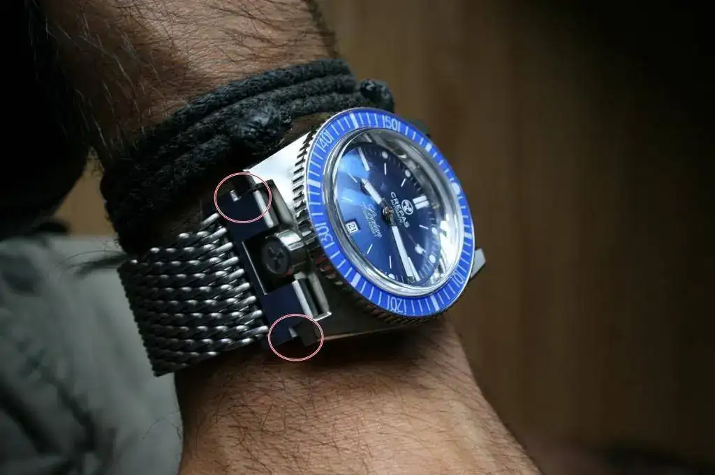 Otra cosa que no me gusta nada es la de los "medio" tornillos de la caja que lleva a las 12 para anclar armis o correas a la caja.....a las 6 no hay otra porque hay que librar la corona......pero a las 12 también van semi partidos, y cuando quieres ponerle la nato o la milanesa pues emho quedan horribles.....:(