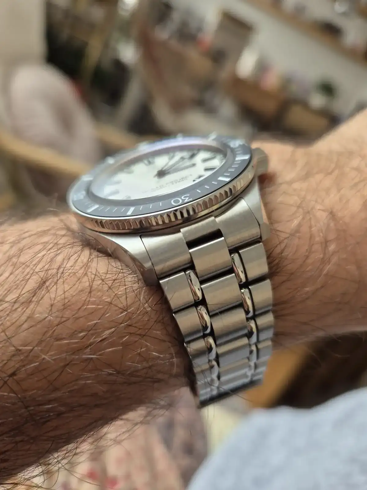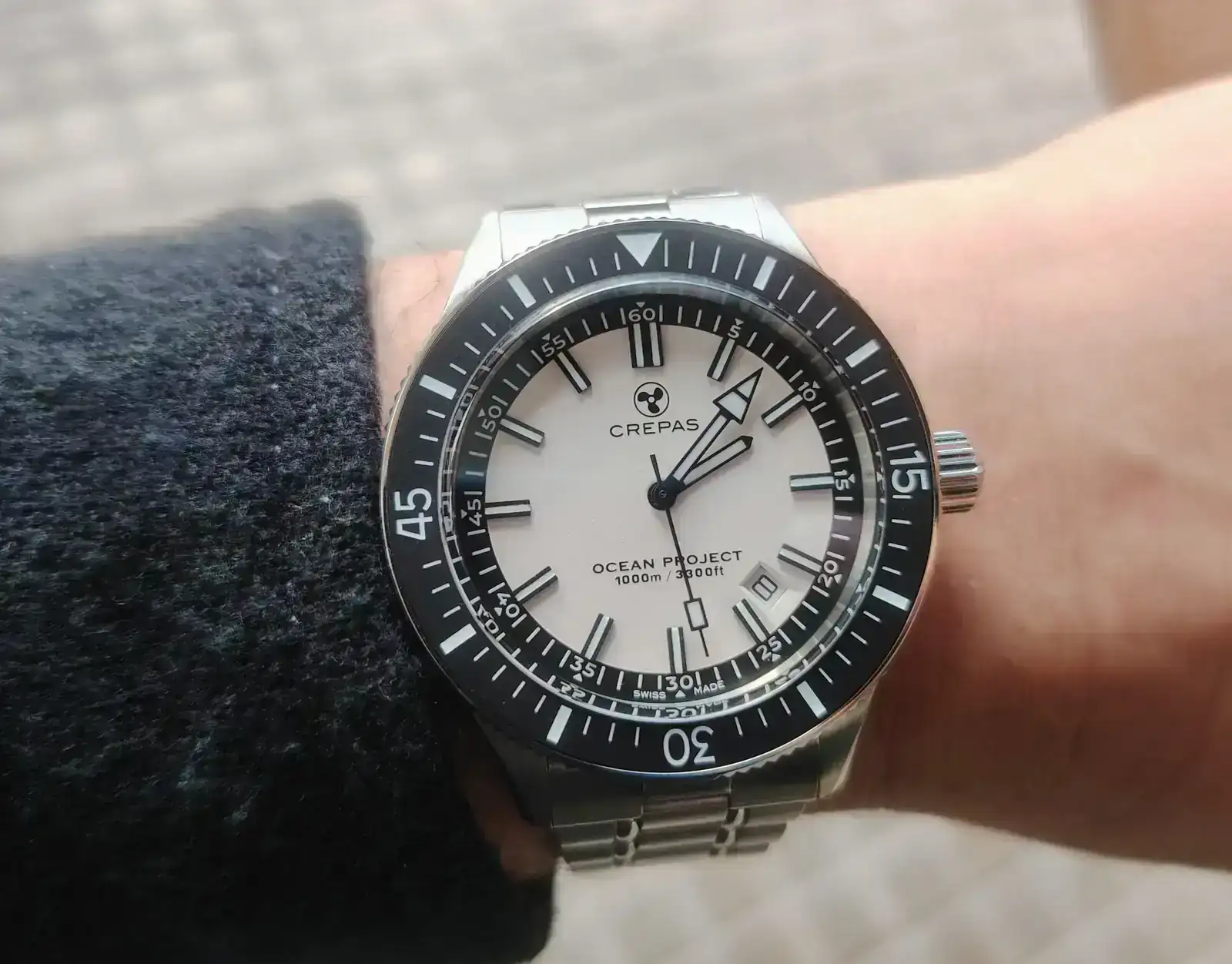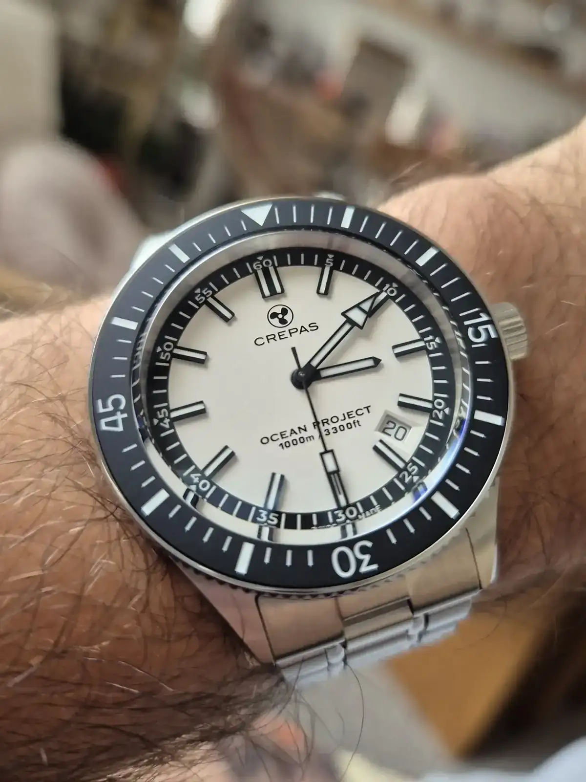 Terminaciones de la caja muy buenas, el cristal (tratamiento antireflejos optimo) sobresale medio mm sobre el bisel, este es ceramico mate. bisel 120 tics, buen tacto, altura de la caja como un reloj de vestir a pesar de sus 1000 metros. Quizas el unico pero seria el tamaño de la corona y al no estar nada introducida en la carrarura acentua la sensacion de su tamaño, pero por otro lado es fiel al modelo que homenajea. 10.