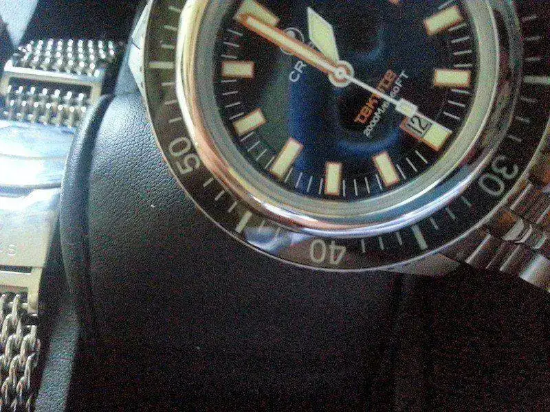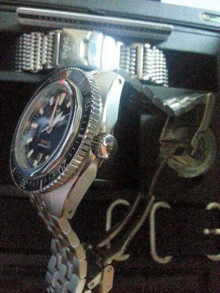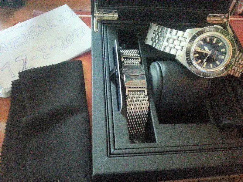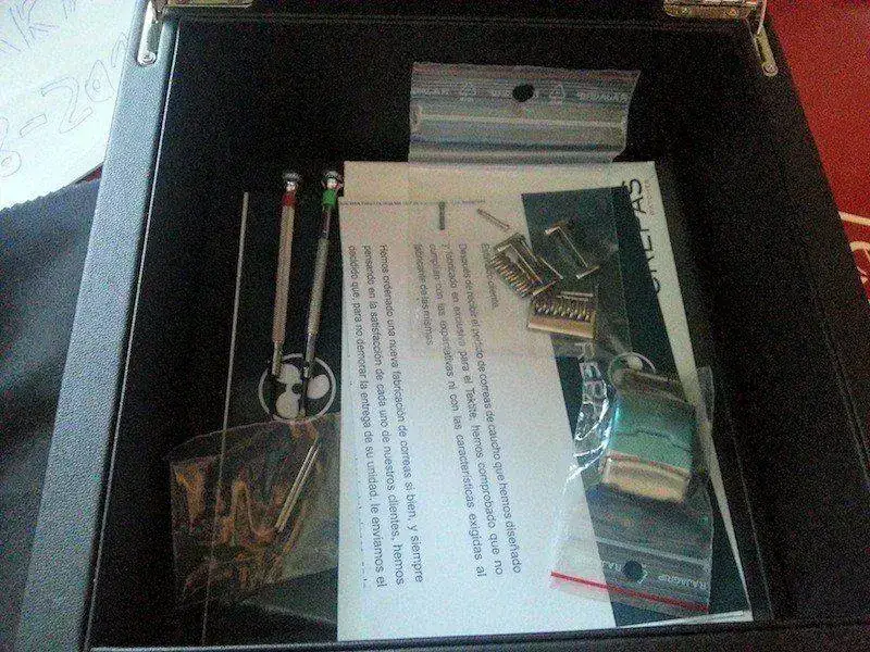 Viene con set completo, milanesa, una nato zulú y correa de caucho ad hoc que aún no he recibido de la casa, la enviaré por supuesto sin gastos al nuevo propietario en cuanto la tenga en mi poder, destornilladores, segundo cierre desplegable para cauchos, balleta de limpieza, libritos, garantía....etc. Su estado es excelente, tan solo destacar un ligero rasponzillo a las 9 en el bisel interno con lo que con una pulidita quedaria como nuevo para los mas sibaritas, intento que se vea en modo macro en la foto 3ª, en directo casi es inapreciable.