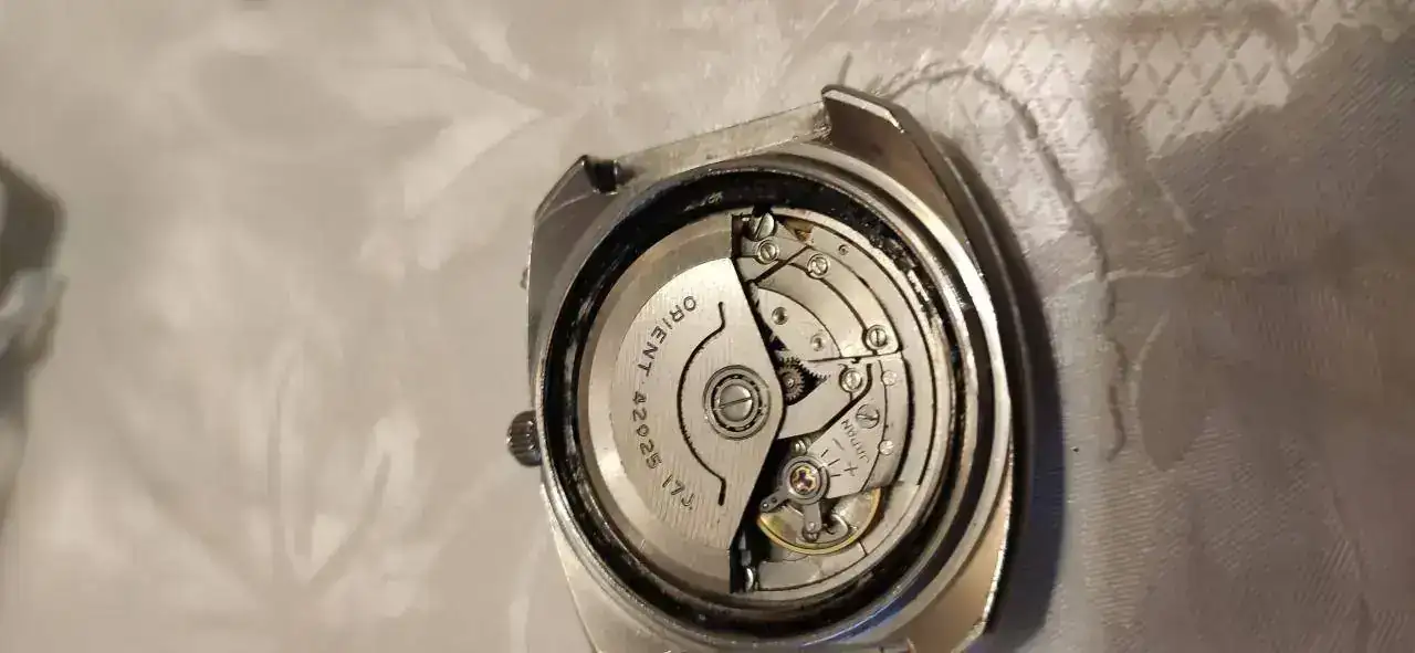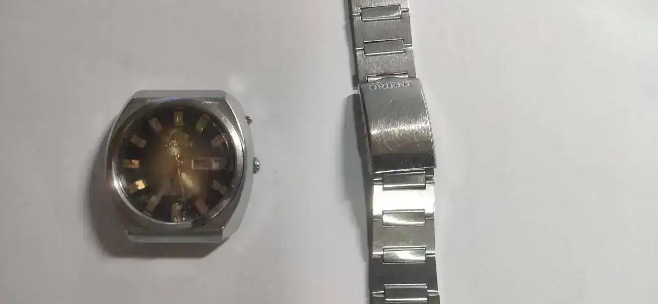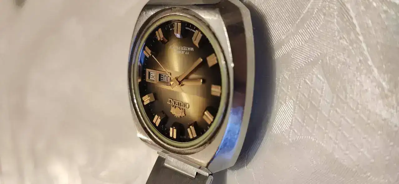 Hasta ahora, solo había adquirido relojes nuevos, pero el otro día, dando un paseo por El Rastro de Madrid, vi en el suelo un Orient del estilo más clásico de los 70. Correa original y maquinaria original como nueva, el único fallo es el cristal, esta destrozado. Lo conseguí sacar por 20€ (no tenía mas efectivo, asi que al vendedor no le quedó de otra).