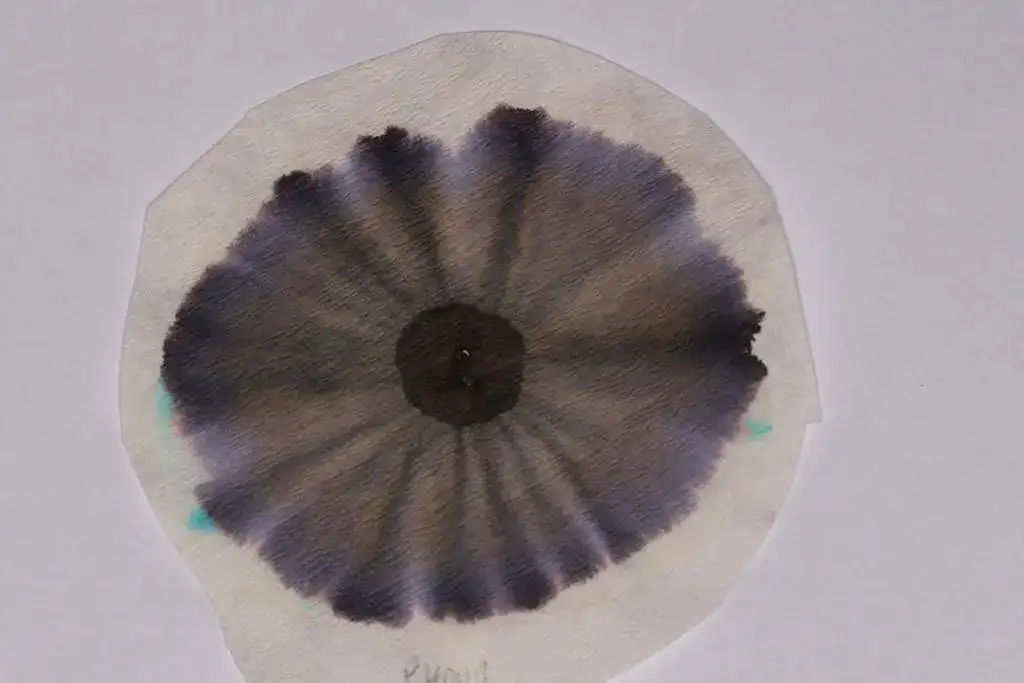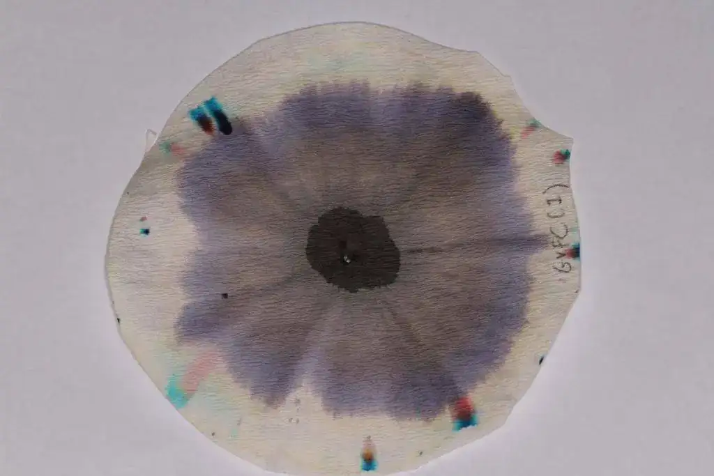 Las cromatografías de las tintas negras son tal vez las más sorprendentes, porque una vez realizadas podemos comprobar, no sin cierta sorpresa, que no todo en ellas es negro. En algunas, de hecho, hay muy poco negro.