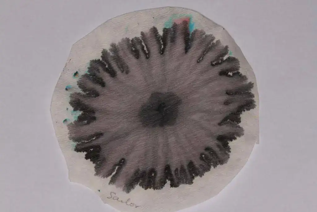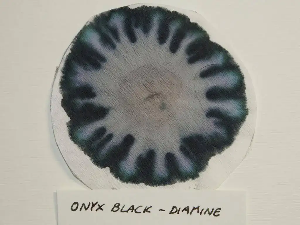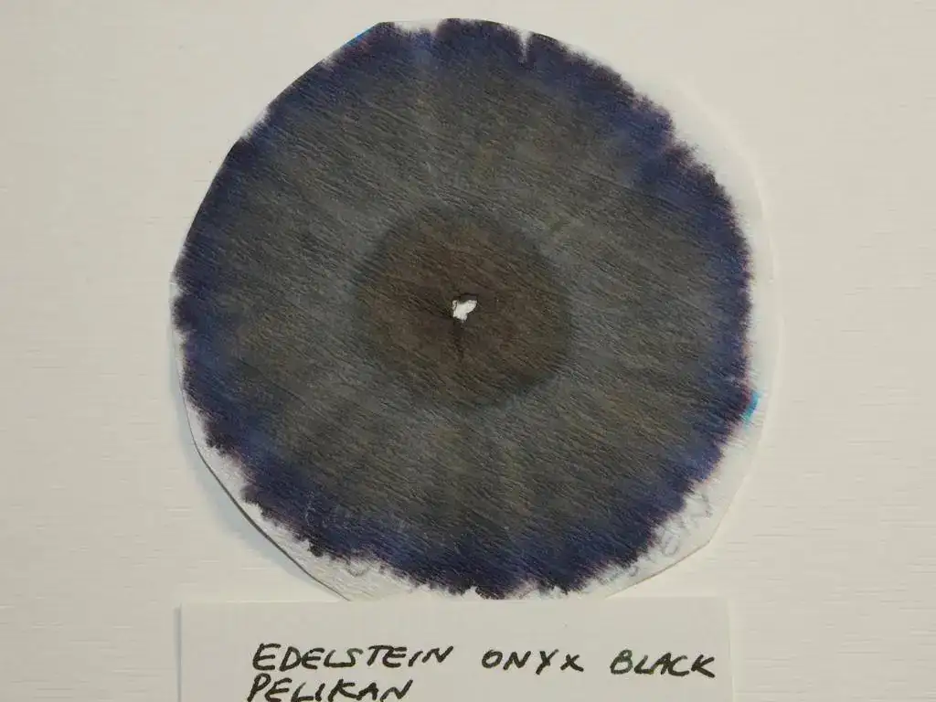 Hay negros marcadamente verdosos, como los Onyx Black de Pelikan Edelstein y Carbon Black de Graf von Faber Castell (en este último hay también una tonalidad marrón muy característica). El verde también aparece en el Onyx Black de Diamine, con una forma de flor muy curiosa. Y como ganadora, es decir, como la tinta más negra de las negras, destacaría en mi prueba a la de Noodler's. Se trata de una tinta muy resistente al agua (es la cromatografía que se ha extendido en una menor superficie de papel, pese haberla tenido el mismo tiempo que las anteriores), y la cromatografía presenta una escala de diversos tonos de gris junto a la tonalidad negra predominante, que se mantiene casi uniforme en toda ella. También es bastante negra (aunque con tonos de fondo marrón y verde, como hemos dicho) la de GvF-C, bastante soluble a juzgar por cómo se ha extendido la gota de tinta inicial.
