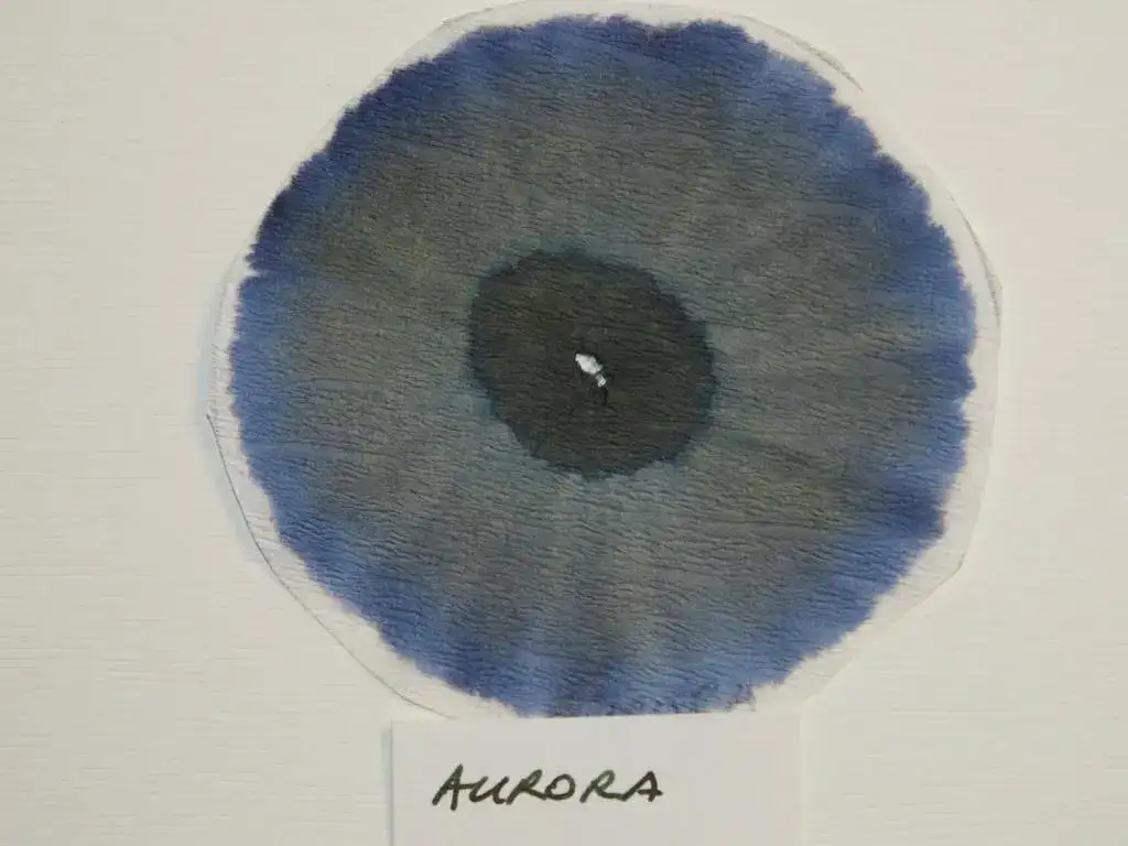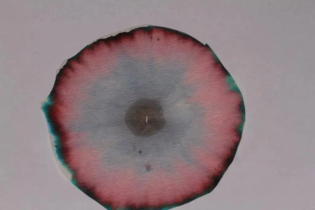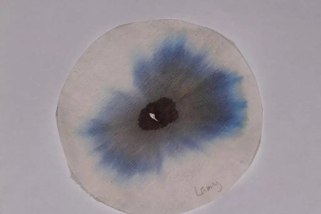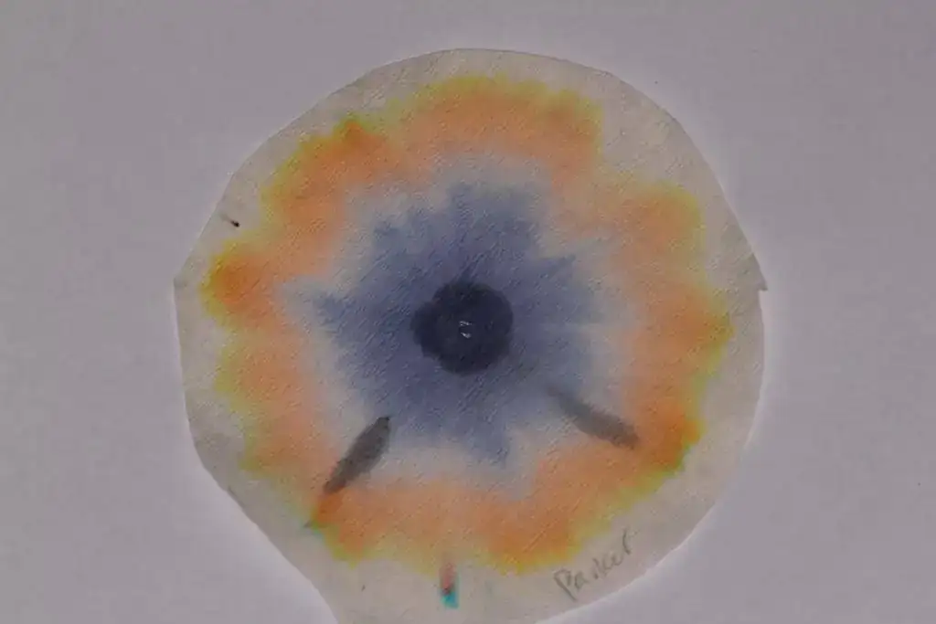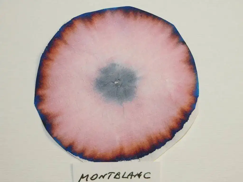 En primer lugar, resulta sorprendente la cromatografía de Montblanc, de cuya gota inicial queda un círculo gris verdoso, rodeado de un gran anillo rosado, con tonalidades anaranjada y añil en los bordes exteriores.