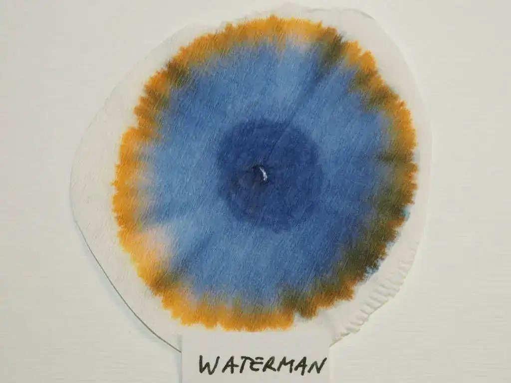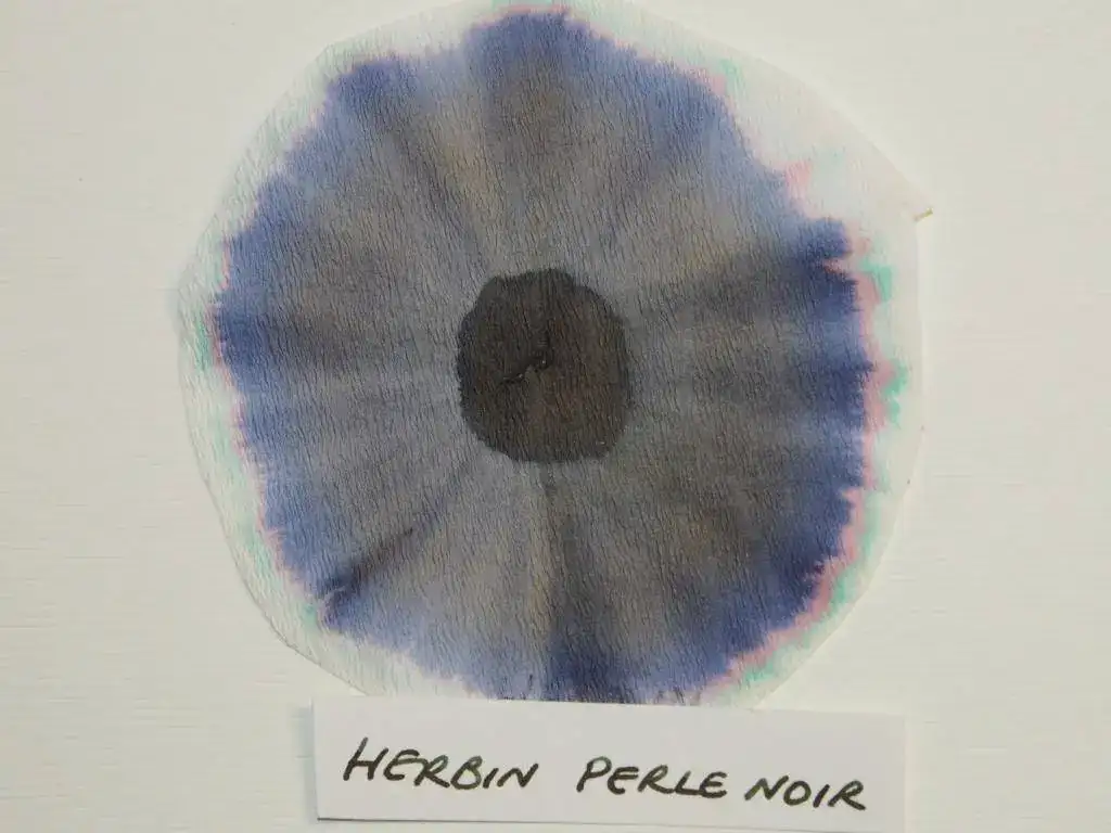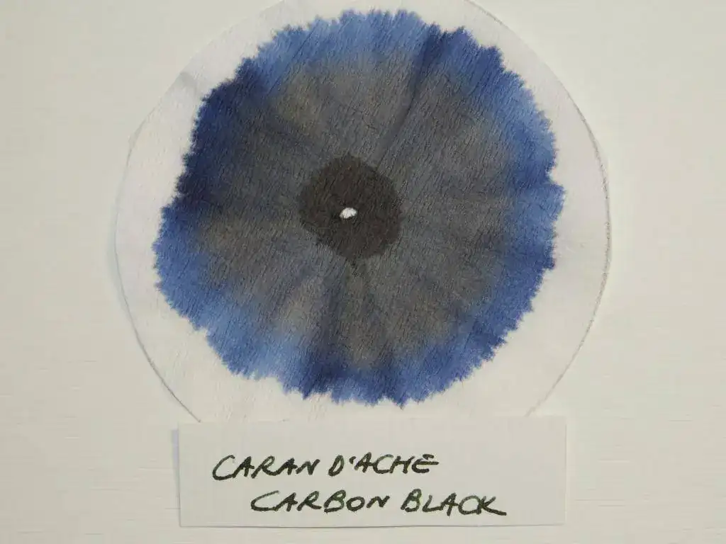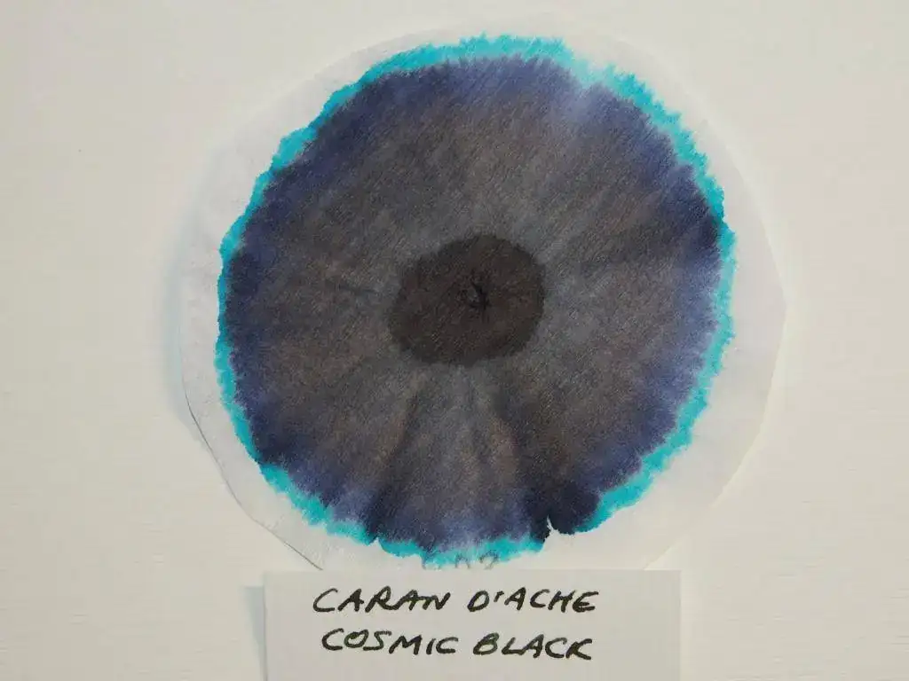 Hay marcas que se resisten a la idea de repetir fórmula. Es el caso de Caran d'Ache, cuyas dos últimas tintas negras, aunque a simple vista parecen idénticas, resultan claramente diferentes a través de las cromatografías. Si bien las dos tintas de esta marca presentan un predominio del añil, la Cosmic Black de su última serie revela un curioso anillo exterior azul turquesa. Este anillo azul turquesa surge también en la cromatografía de la "Perle Noire" de Herbin, junto a tonalidades rosas y añil. En la de Waterman, por el contrario, llama la atención su anillo exterior anaranjado, junto a una tonalidad predominante añil y tonos intermedios verde y marrón.