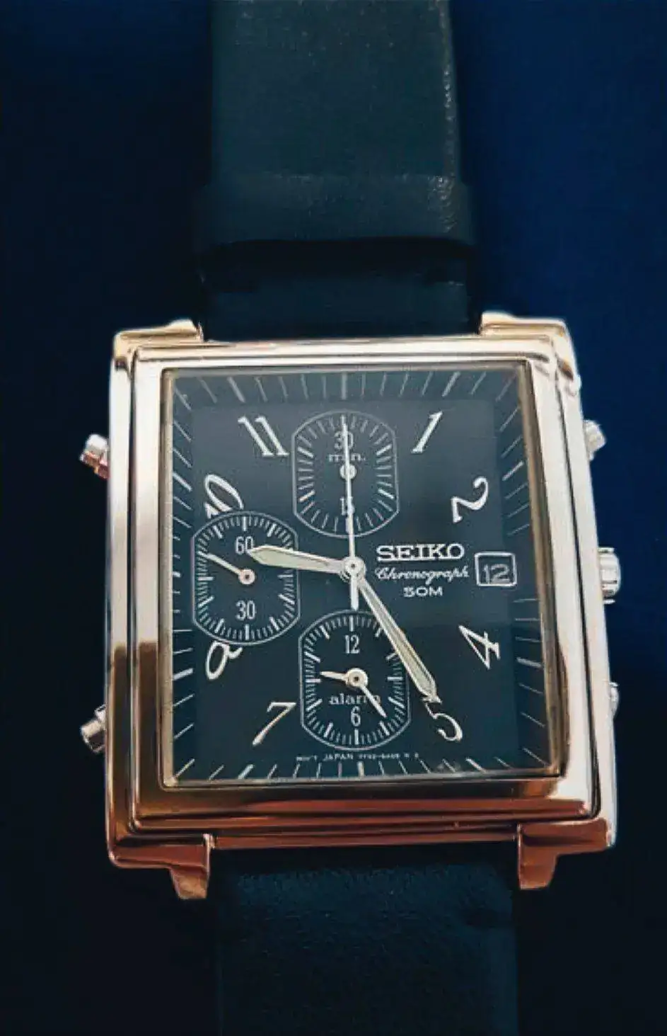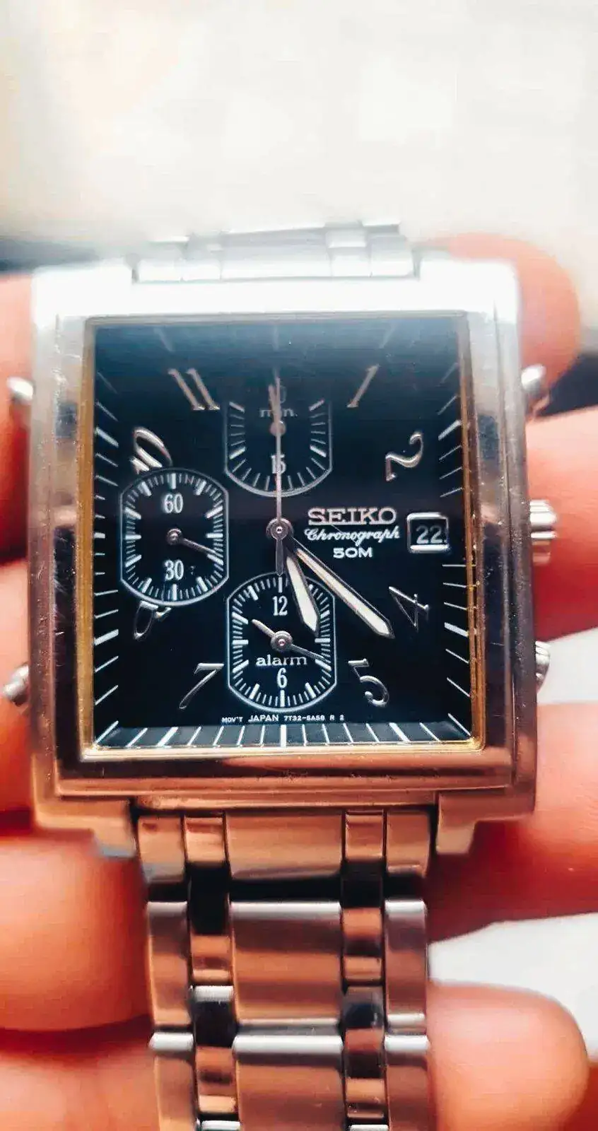 En otro post había publicado un reloj Seiko cuadrado que quería comprar y me perdí la compra. Ahora conseguí éste y la verdad me gusta mucho más que el otro. Excelente estado y funciona todo a la pereccion. Muy feliz. Un modelo del cual no hay mucha información, es un SEIKO 7T32-5A70 BLACK FACE CHRONOGRAPH BELL ALARM - Men - 1980-1989