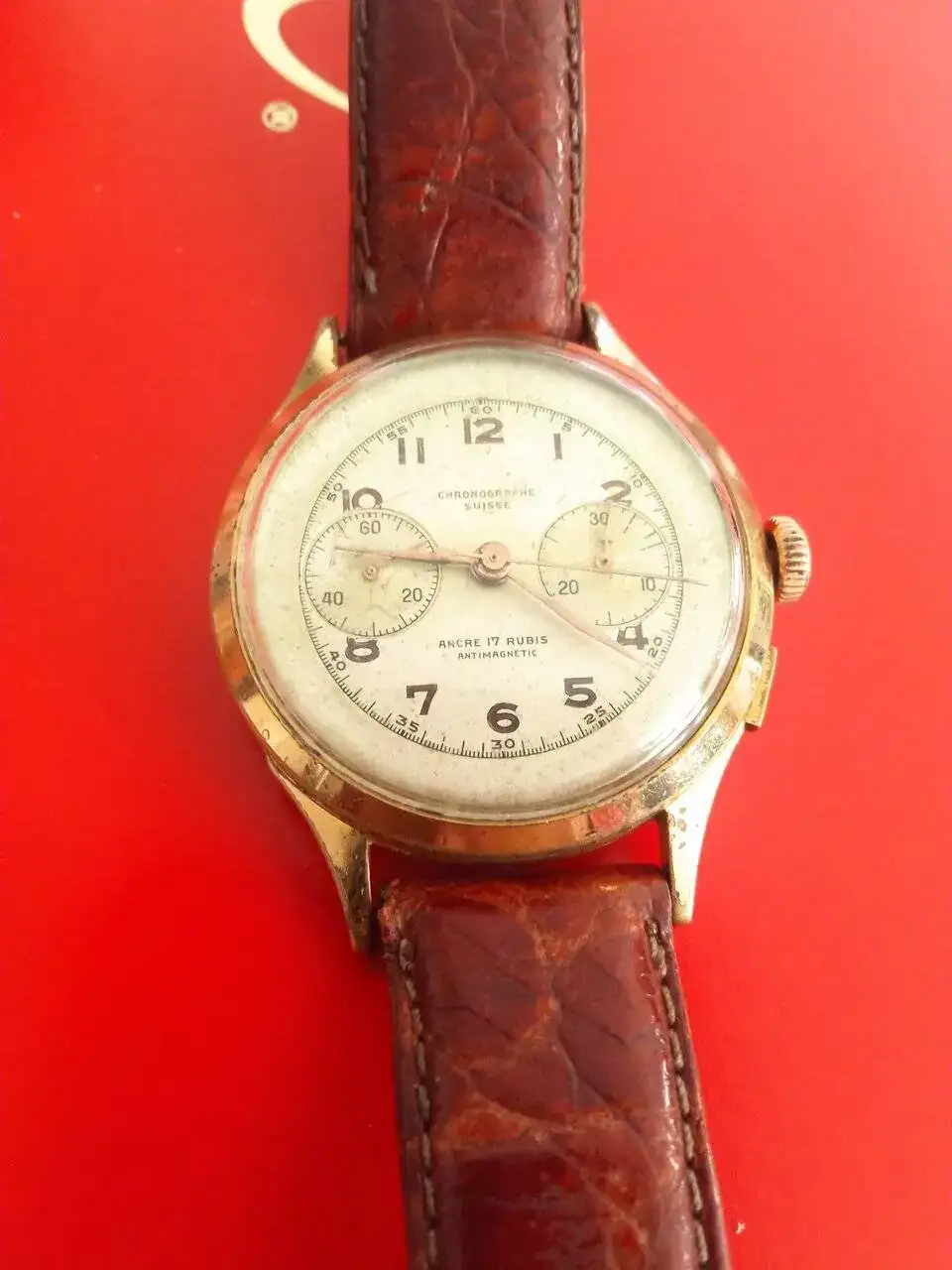 Saco a la venta esté cronógrafo de marca sin marca pero con la conocida maquinaria Landeron 48. El reloj está en un estado más que aceptable en general pero tiene sus pequeñas faltas de baño dorado en la caja. El reloj va muy exacto ya que acaba de salir del relojero, pero no siempre resetea a cero, a veces se queda la aguja un segundo antes. Podría llevarlo otra vez para que me lo revise, seguro que es una tontería, pero no creo que merezca la pena, el plexi tiene una rajita, se nota dependiendo de como le dé la luz, yo lo dejé puesto ya que no me importaba. Le pongo un precio creo que bastante ajustado para los precios a los que se suelen vender, 250 euros con envío certificado a península. Solo hago esa clase de envío, nada de empresas de reparto.