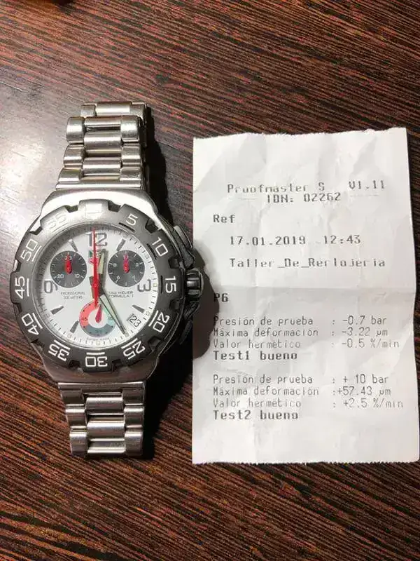 A 17 de enero de 2019 al reloj se le ha cambiado pila y se le ha hecho prueba de estanqueidad con resultado totalmente positivo, se adjunta hoja de control de la relojería.