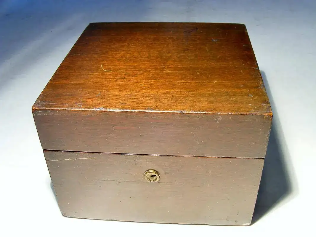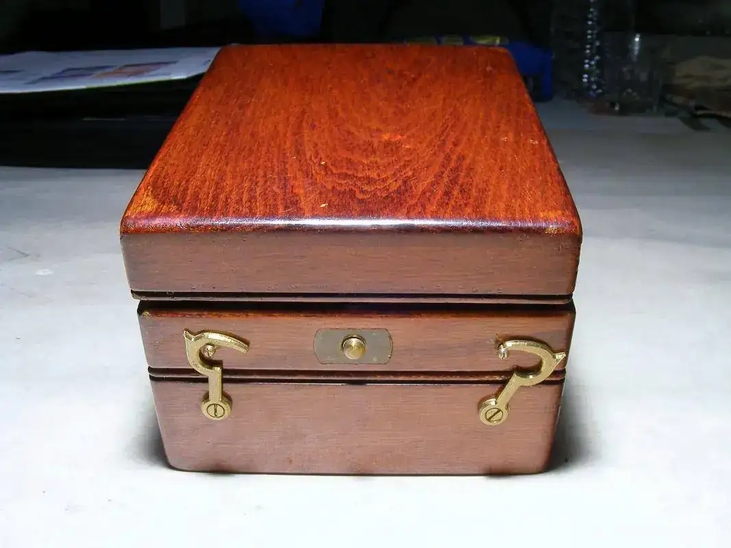 Su caja de madera de Caoba y algo más pequeña que la del Hamilton 21, concretamente es de 15 x 15 x 15 cm,