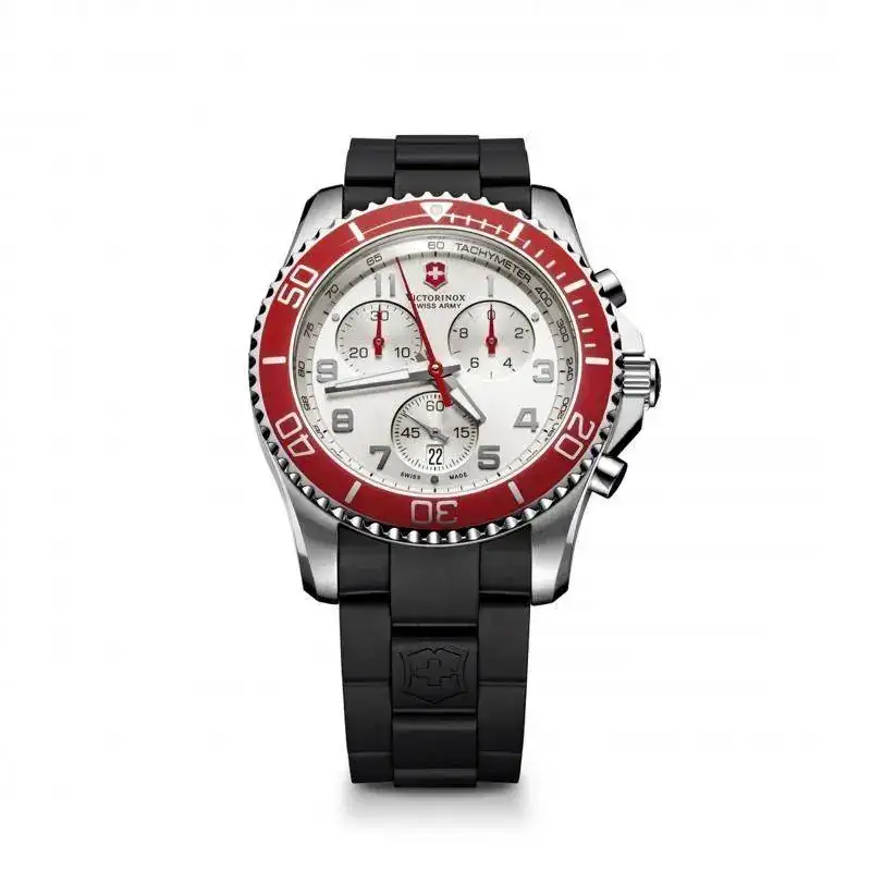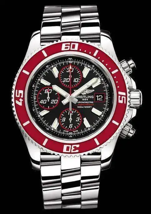 Datos: crono, esfera plateada, creo, aunque no es seguro, que con reflejos en rayo de sol, bisel rojo, 40 cms. más o menos, con armis, es posible que sea vintage - tiene un aire- aunque tampoco es seguro y en todo caso y, si lo es, no es ningún abuelete y es muy, pero que muy bonito. El contraste entre la esfera y el bisel es realmente llamativo. Es bastante elegante.