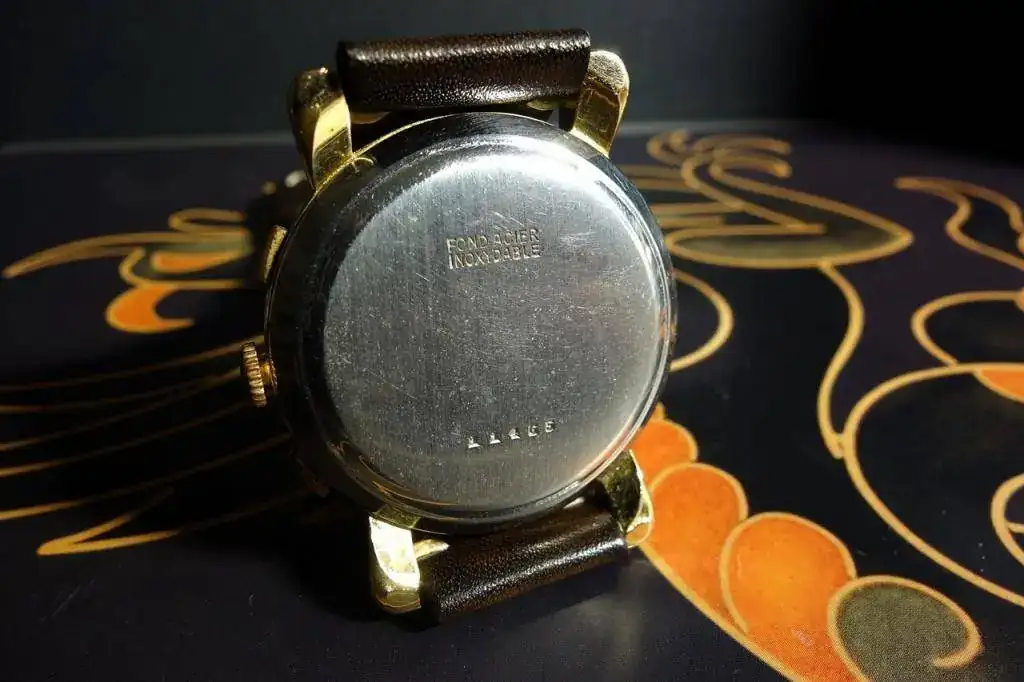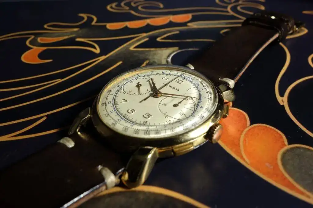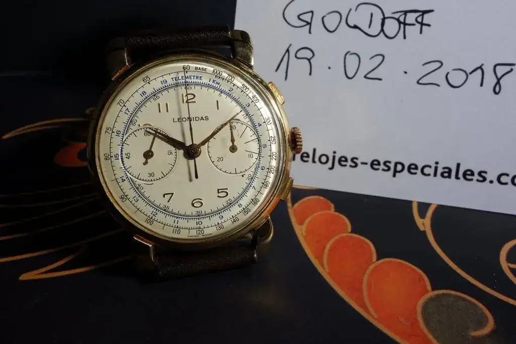 sigo liquidando mi humilde colección de vintages para construir otra igualmente humilde, pero diferente. En esta ocasión pongo a la venta un crono Leonidas restaurado de esfera y caja con calibre Landeron 48 de remonte manual y funcionamiento del crono convencional (arranque y paro a las dos y reseteo a las cuatro). Como digo, está todo restaurado y presenta un aspecto imponente. Ideal, creo, para aquellos que quieren un look Vintage pero no están dispuestos a soportar desconchones y/o deslucidos. La caja (39mm, super actual) es chapada en oro y el fondo es de acero con la numeración perfectamente visible. Funciona correctamente.