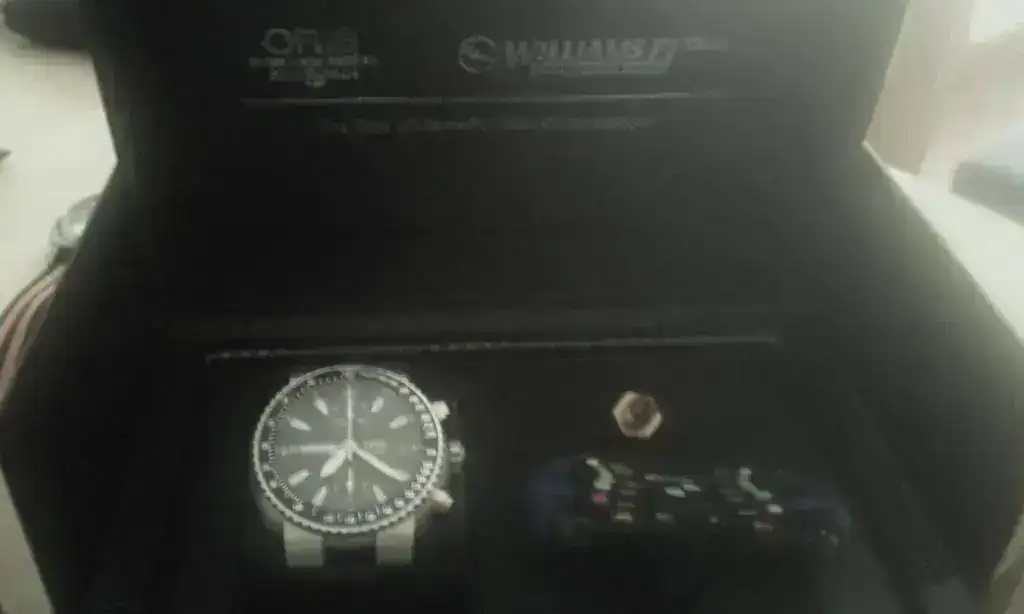 Se te manda con la caja exterior de cartón, la interior de polypiel con todos los gadgets: Una bujía del coche y una copia del volante del formula uno, junto con los papeles del reloj y la garantía vencida ya hace tiempo.