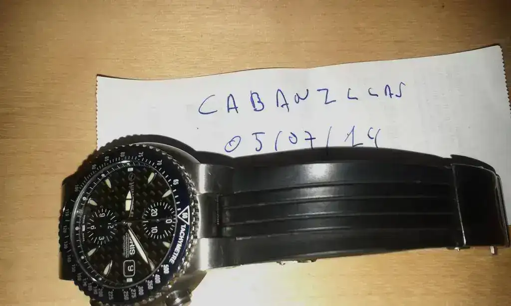 Caja de titanio de 44 mm, pero que como es de tipo piramidal, en la muñeca se ven como 43. Correa de caucho original cortada para muñecas de hasta 18/18,5 centímetros, más o menos. (Yo soy