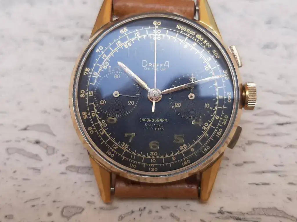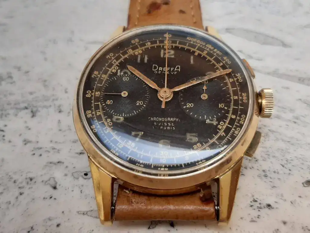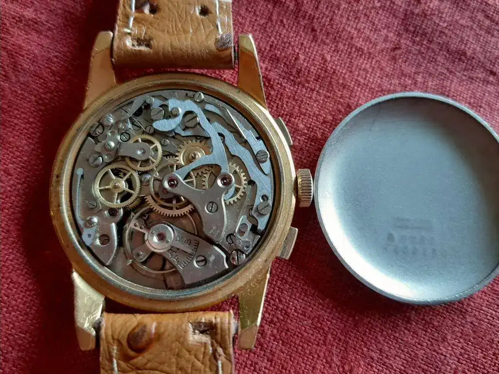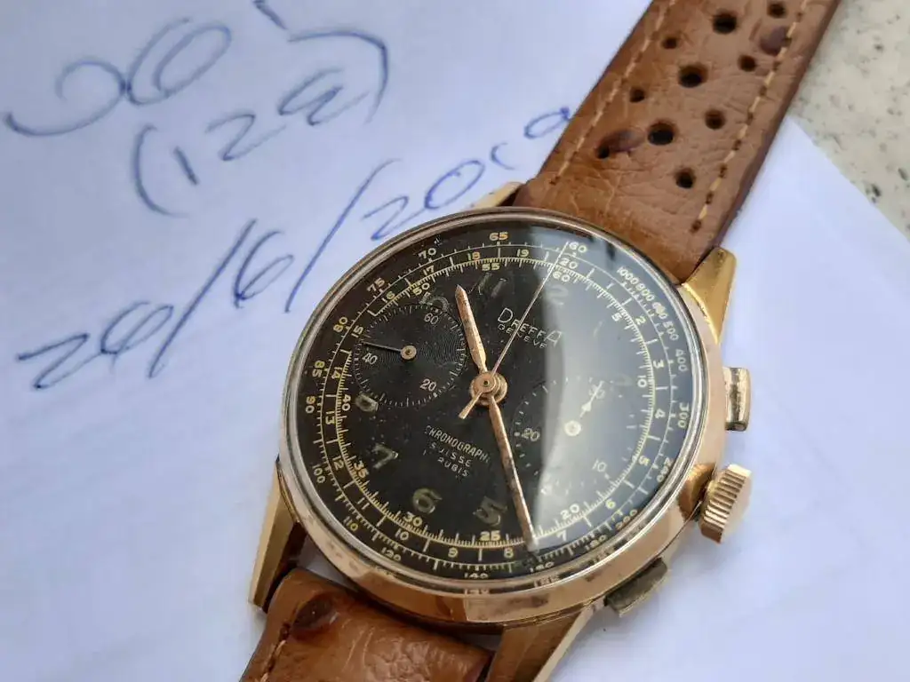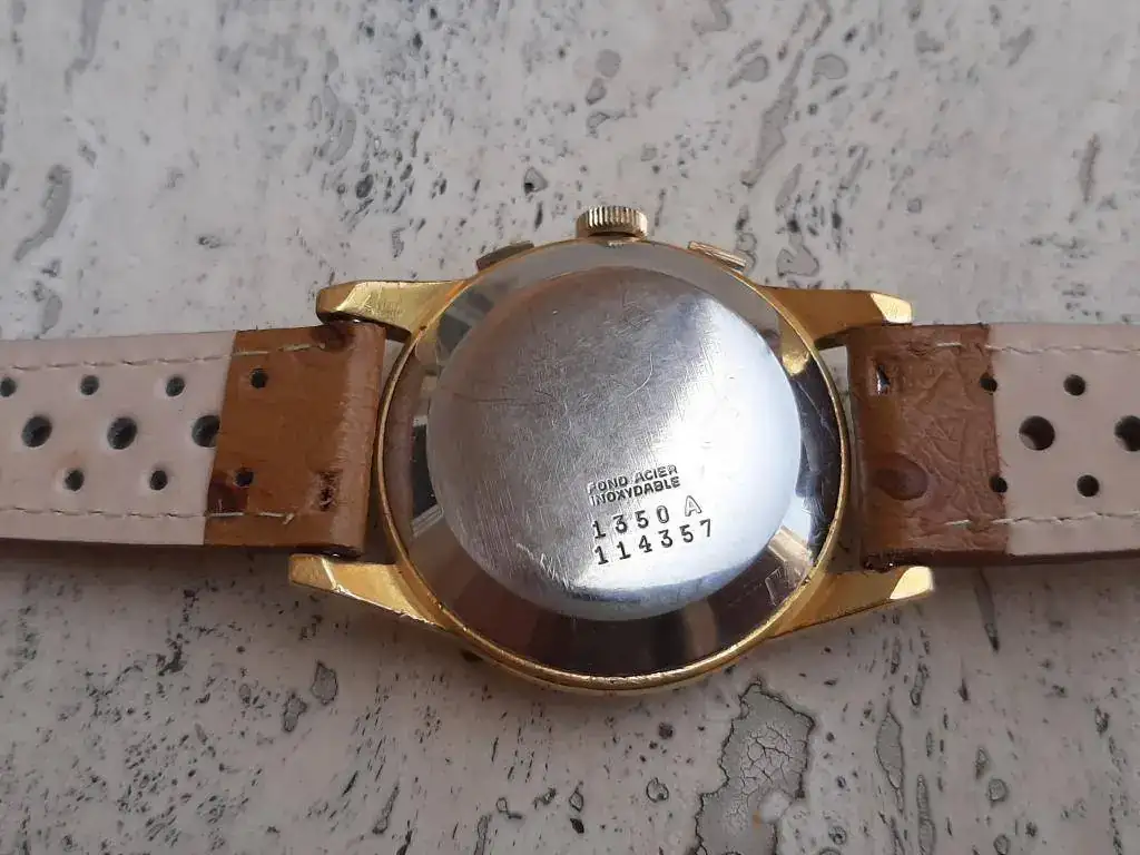 Saco de caja este precioso y raro crono cincuentero equipado con calibre manual Landeron 151, robusto y fiable, funcionando correctamente en todas sus funciones. Caja grande para la época (37mm) en excelente estado, sin desgaste, con todas sus aristas. Lo mejor es la esfera negra con grafía dorada muy bien conservada, con mínimos signos de la edad justos para evidenciar su carácter vintage. Se entrega con correa rally artesana de piel a estrenar, hecha en Suecia.