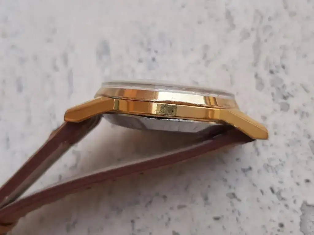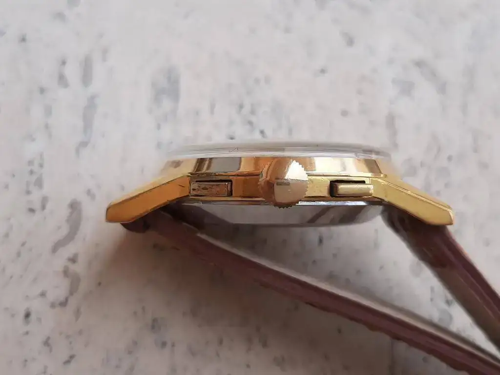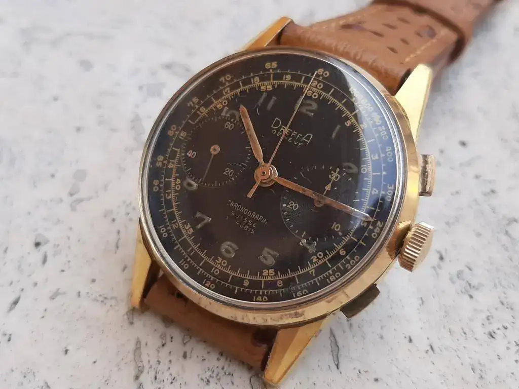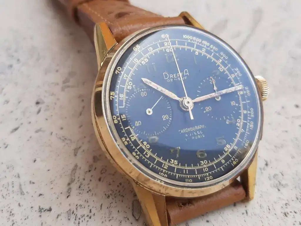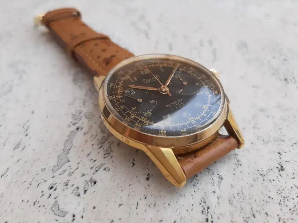 Saco de caja este precioso y raro crono cincuentero equipado con calibre manual Landeron 151, robusto y fiable, funcionando correctamente en todas sus funciones. Caja grande para la época (37mm) en excelente estado, sin desgaste, con todas sus aristas. Lo mejor es la esfera negra con grafía dorada muy bien conservada, con mínimos signos de la edad justos para evidenciar su carácter vintage. Se entrega con correa rally artesana de piel a estrenar, hecha en Suecia.