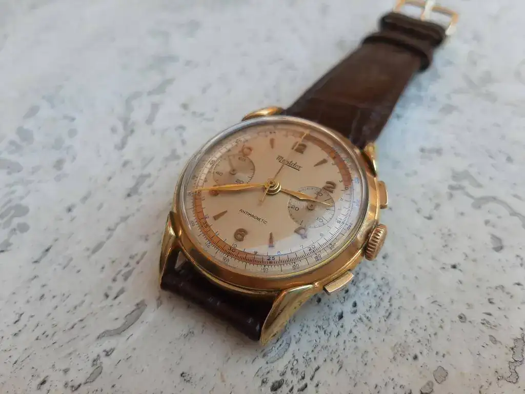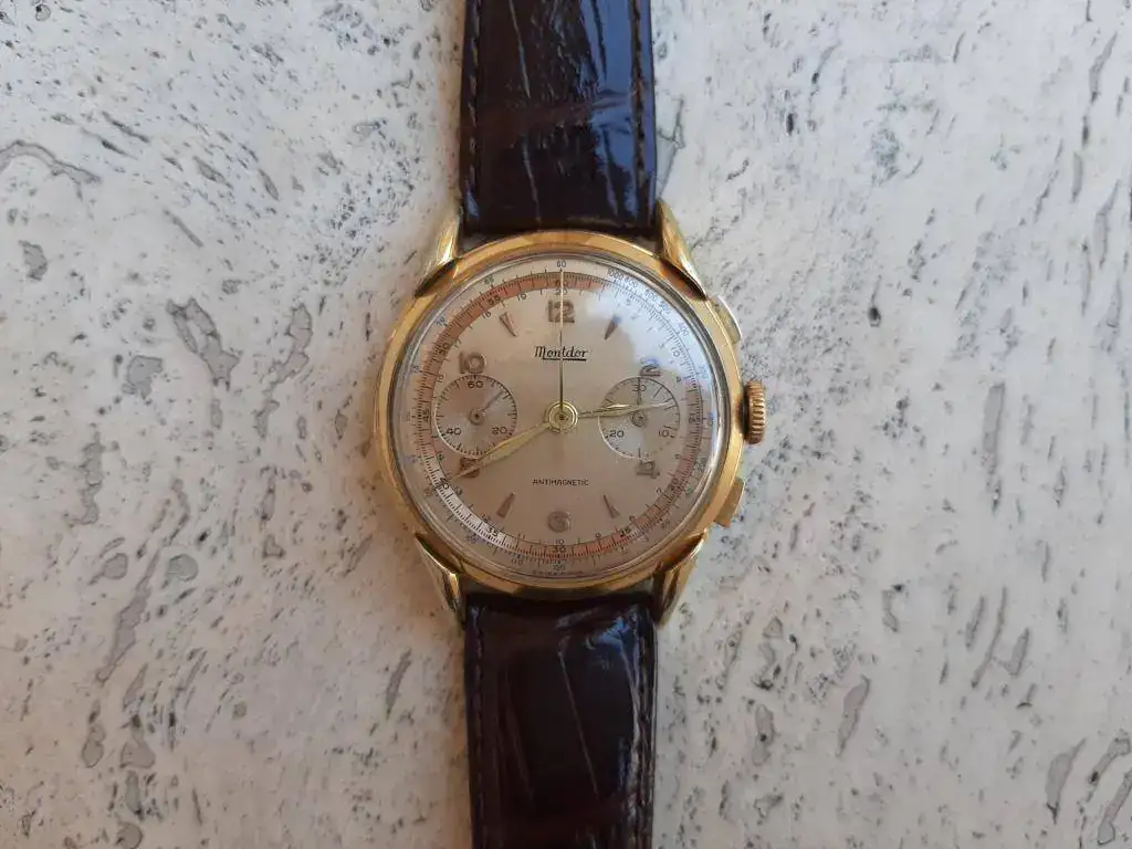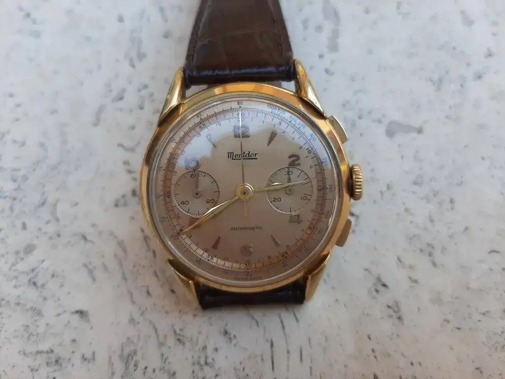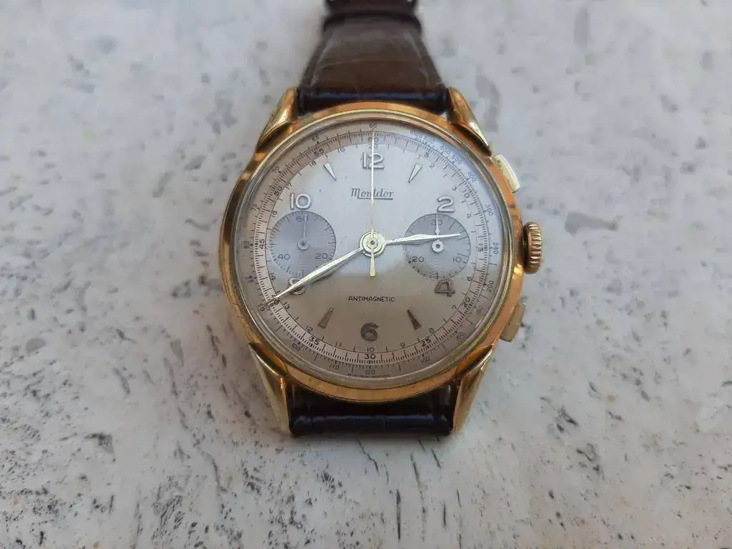 Saco este hermoso cronógrafo suizo vintage de los años 50 de la marca MONTDOR en excelente estado de conservación, equipado con calibre manual Landeron 48, robusto y fiable, funcionando correctamente en todas sus funciones. Tanto la caja con asas decoradas como la preciosa esfera están en excelente estado, obviamente sin descartar alguna microseñal de su carácter vintage.