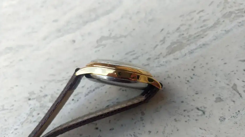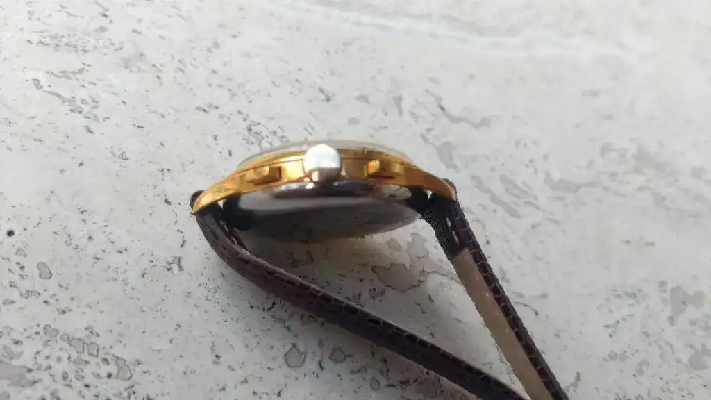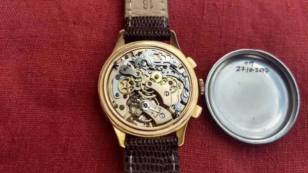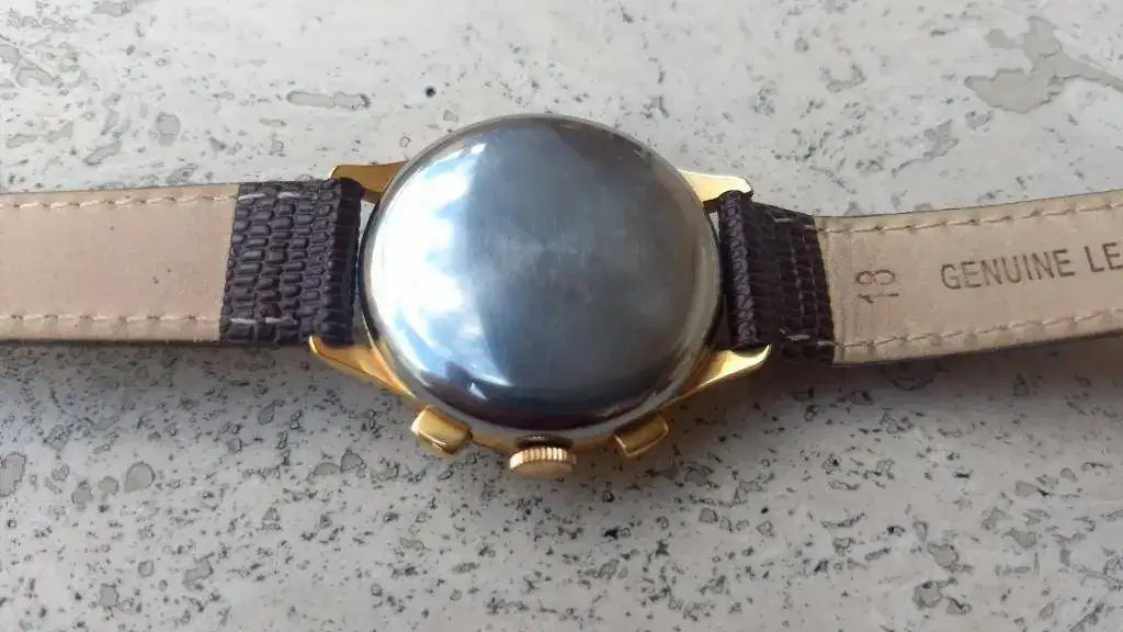 Caja de dimensiones generosas para la época: 37mm sin corona, gran empaque en muñeca. En tiempos en que lo normal era 34-35mm, los de 37-38mm eran muy pocos y por ello están hoy más buscados. Caja plaqué de oro rosa sin desgaste ni desconchones, muy íntegra sin olvidar que es un reloj de unos 60 años que ha sido usado aunque bien cuidado, y por tanto no se descarta alguna señal de uso y edad. Esfera y plexy en perfecto estado.