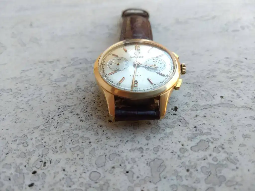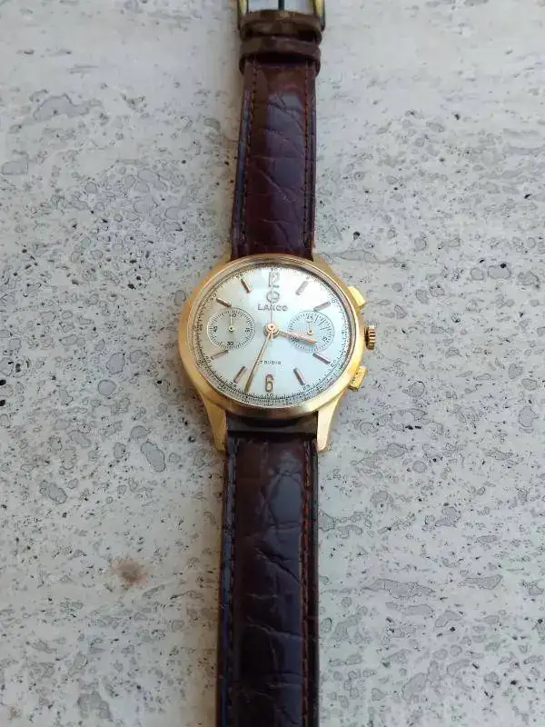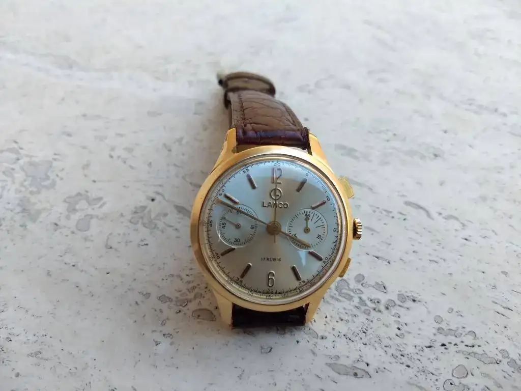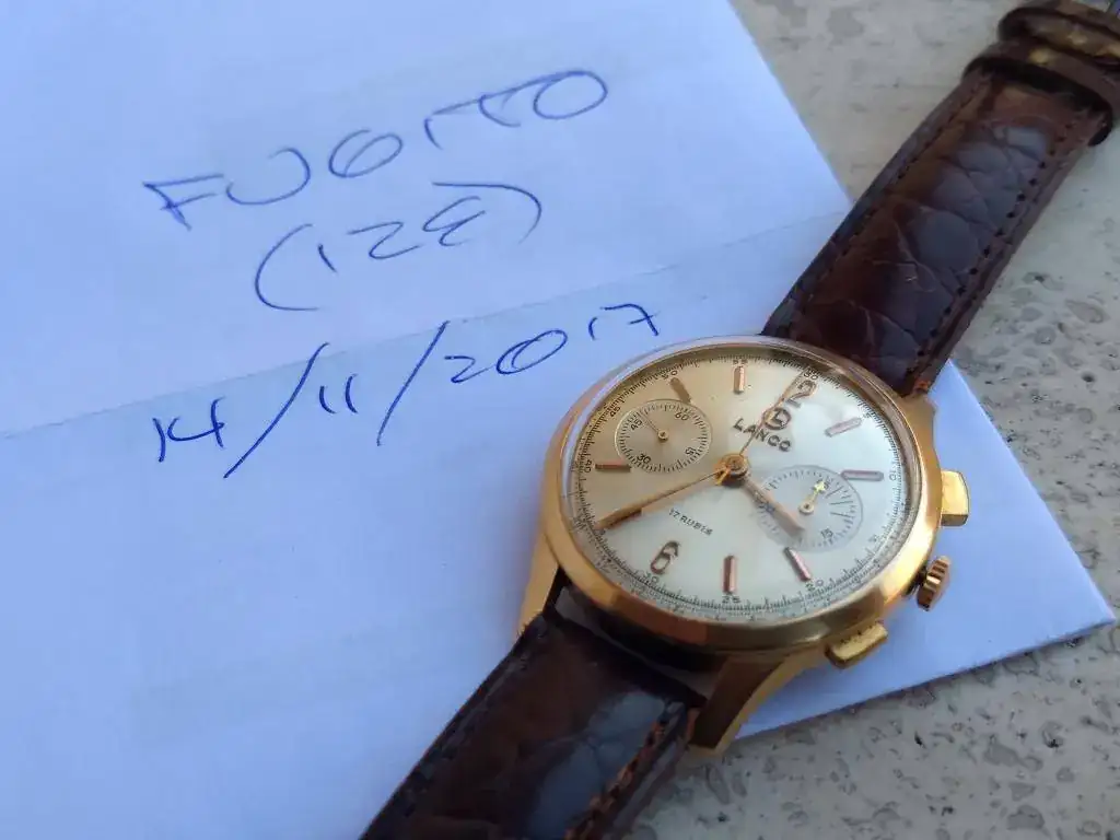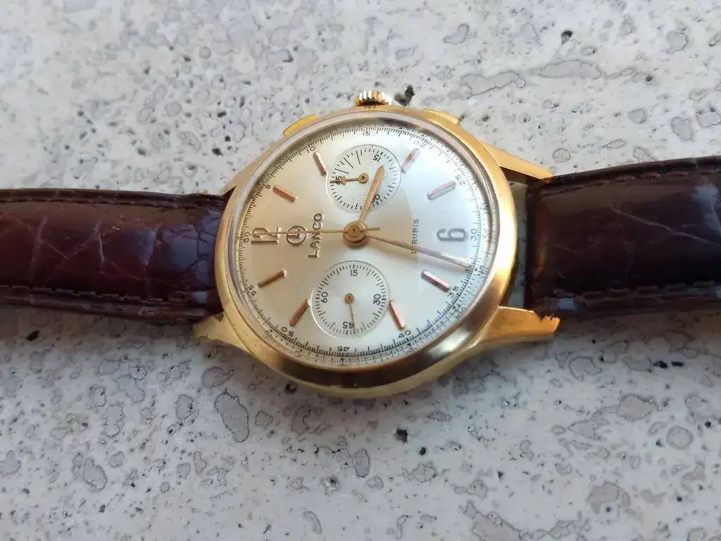 Saco este hermoso cronógrafo suizo vintage de los años 60 de la histórica casa relojera LANCO (Langendorf Watch Company) en un estado de conservación excepcional. Equipado con calibre manual Landeron 248, robusto y fiable, en perfecto estado de funcionamiento.