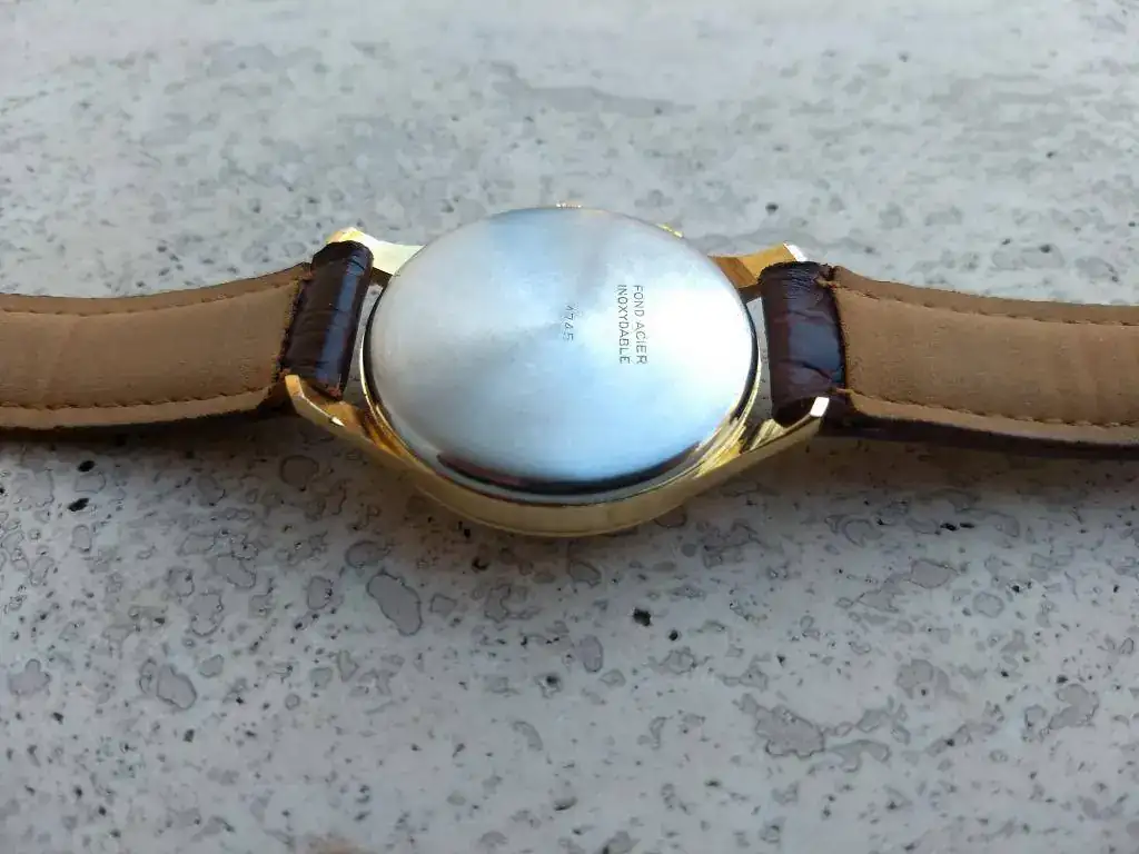 Caja de dimensiones generosas: 37.5 mm sin corona, con presencia y empaque en muñeca. Preciosa esfera nacarada "soleil" (difícil de fotografiar) prácticamente impoluta, sin ninguna pátina ni desgaste.