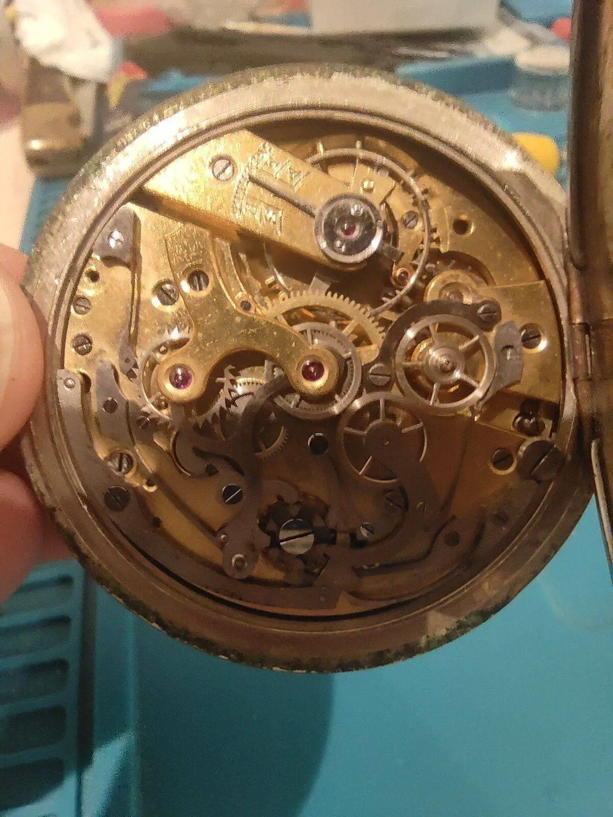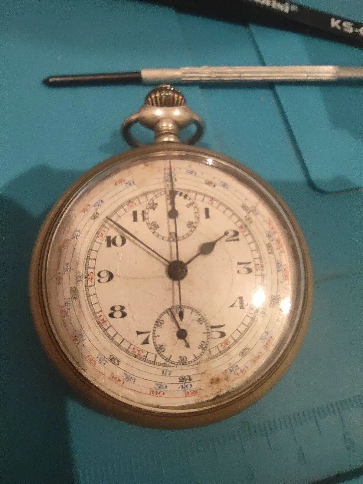 Hola compañeros, tengo ese cronógrafo que no logro identificar visualmente, la caja es de Níquel (creo) y no hay marca por ningún lado. Todavía no lo he abierto ( tiene según parece la cuerda rota) volante bien, espiral también. Y visualmente parece entero con sus resortes bien pero no logro identificar el calibre.