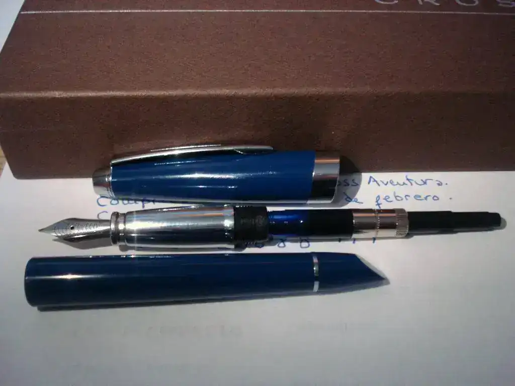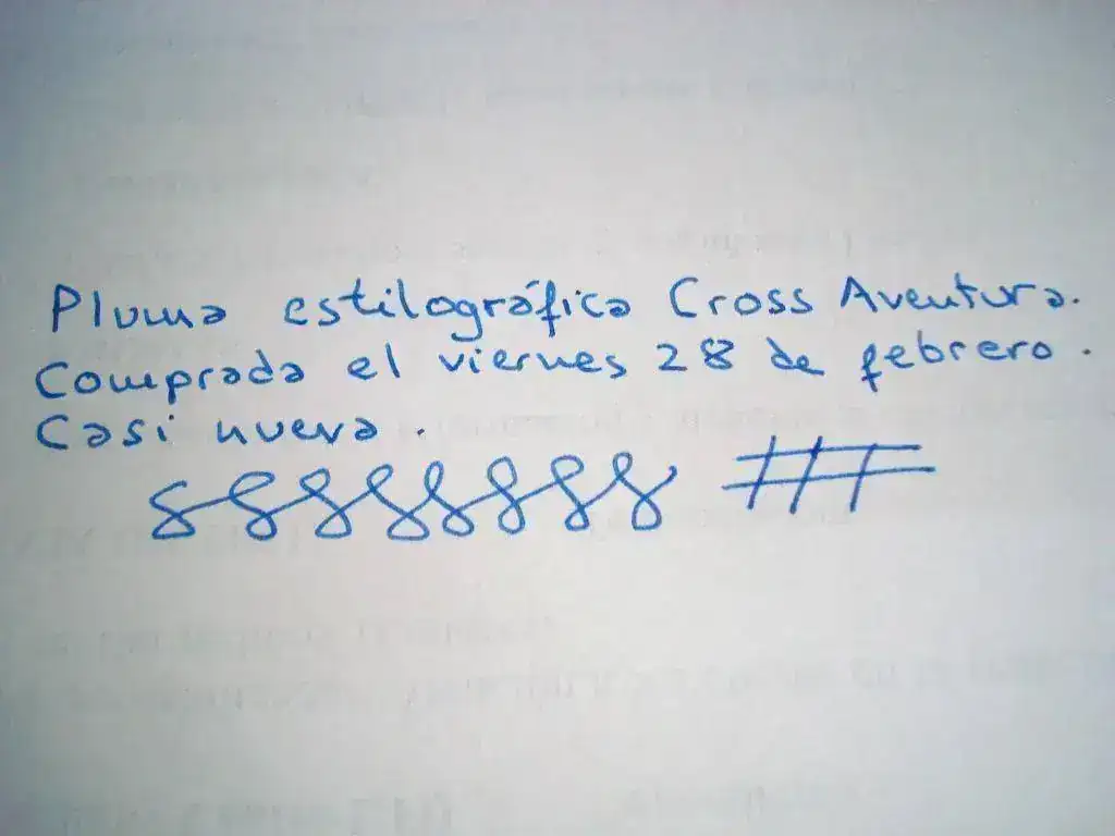Vendo esta pluma, Cross Aventura de color azul. Es prácticamente nueva ya que la compre en la calle Carranza de Madrid hace apenas 5 días pero no acabo de pillarle el punto y por eso la pongo a la venta. Funciona perfectamente y apenas se ha usado. Viene con su caja, su conversor (adquirido aparte), su factura y su garantía sellada en la misma tienda donde fue entintada con tinta azul Pelikan y probada. El plumín es de trazo medio/fino. Este modelo es muy difícil de encontrar ya que acaba de ser descatalogado y hubo que pedirlo directamente a la casa Cross en la que sólo tenían este ejemplar así que aprovecha la oportunidad por sólo 50 euros con gastos de envío incluidos.
