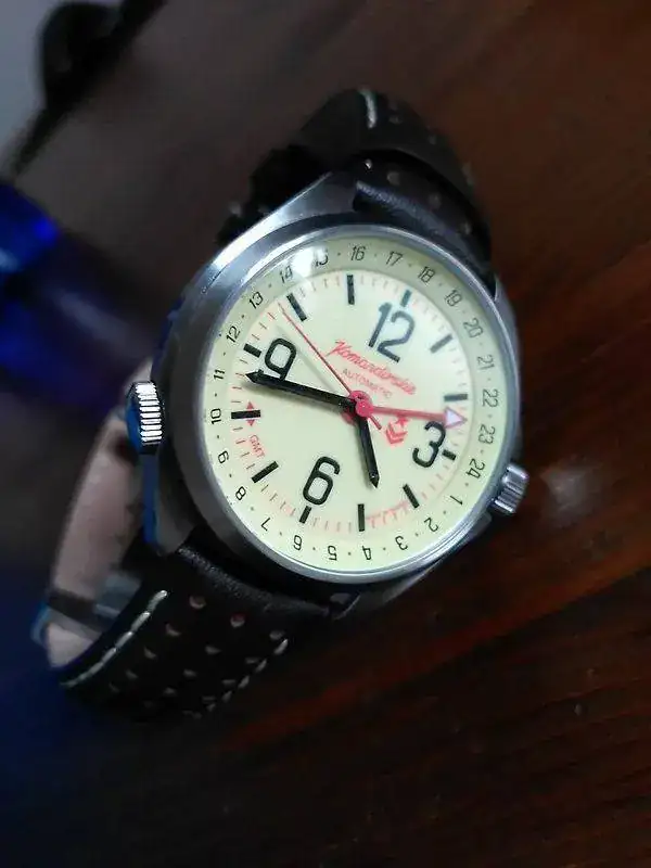 Yo tengo un Komandirskie K-34. No es un GMT del todo, ya que la aguja 24 horas gira solidaria a la de las horas, pero se puede establecer un huso horario distinto girando el bisel