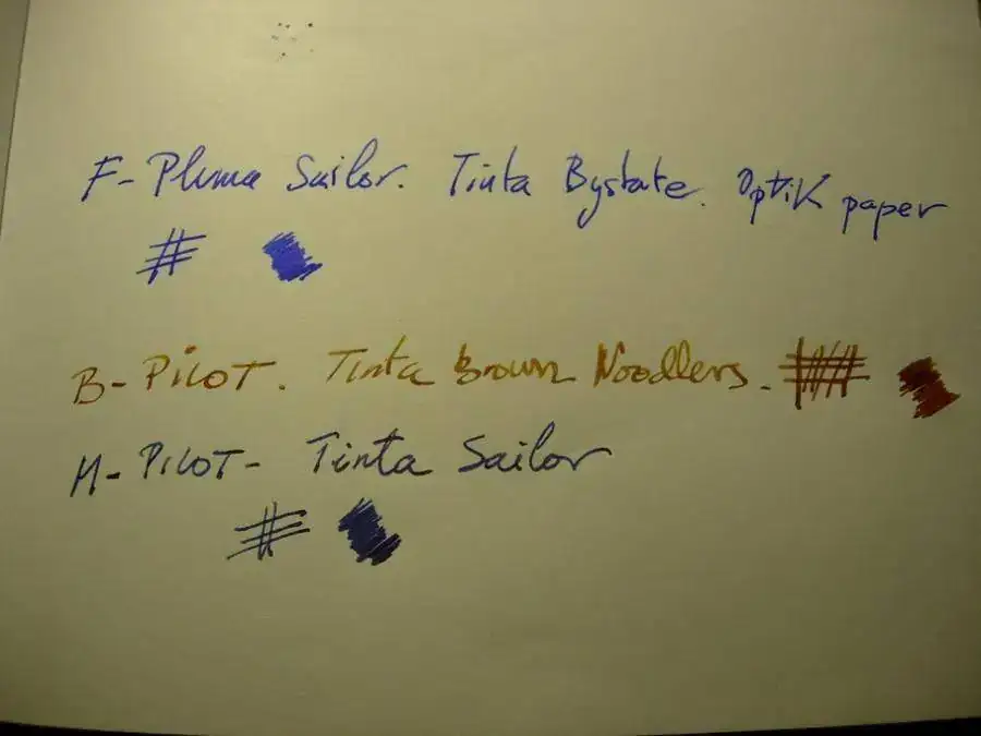 Mi prueba crítica es con la tinta azul Bystate de Noodlers. Que martiriza cualquier papel que se le ponga por delante. Salvo el optik. Hay un ligero eco, pero eso ligero. Tanto que pasa desapercibido. Con cualquier otra tinta nada de nada. Sailor, Waterman... No se ve nada en el otro lado. El papel es como una roca. Pero con la ligereza de los otros cuadernos de referencia, como Rhodia y demás.