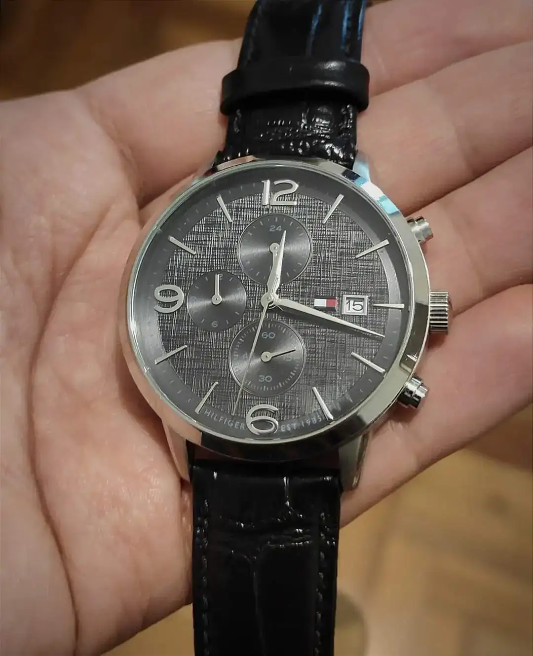 Un Tommy que me llamo la atención en su momento y compré sin averiguar, antes de entrar a la afición. Quería un reloj de carátula y correa negras de cuero para usar en fiestas y eventos más formales. Después con el tiempo me di cuenta que no era este precisamente el estilo de los relojes de vestir, y sus 42mm se me hicieron grandes acostumbrado a llevar piezas de 40 máximo.
