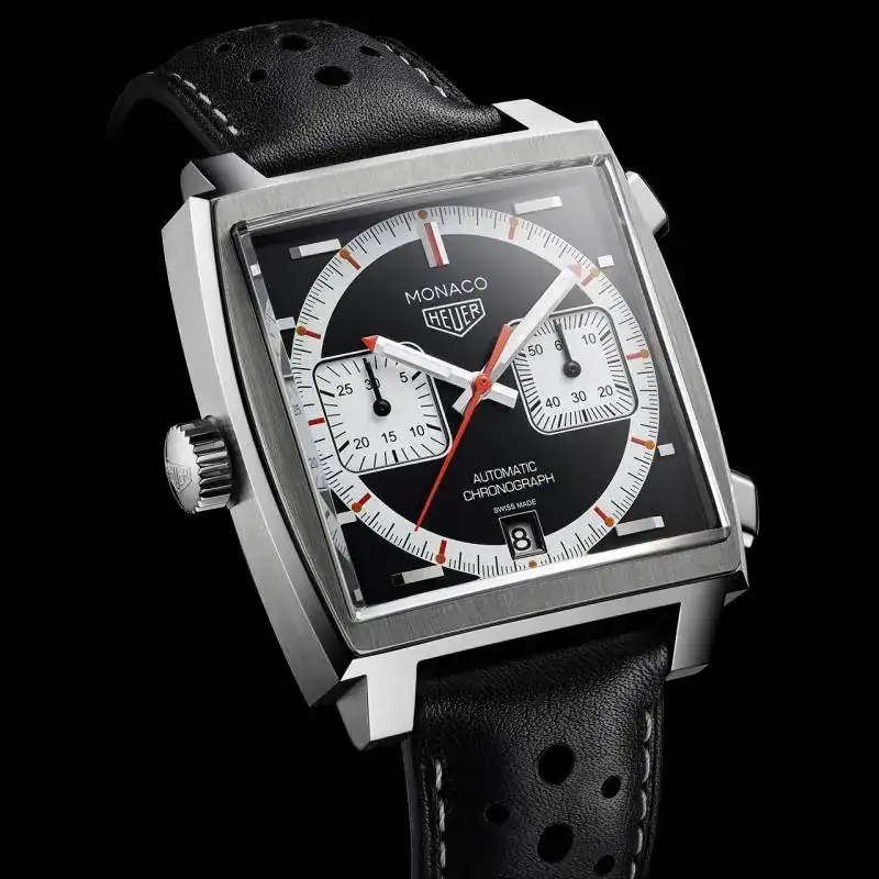 El cuarto reloj de pulsera de la línea Monaco Through Time, combina el blanco y el negro en su esfera, y tiene toques en rojo como la trotadora, los índices y el extremo de las agujas minutera y horaria. Caja en acero inoxidable con una correa de piel de becerro negra perforada con forro blanco y costuras también blancas.