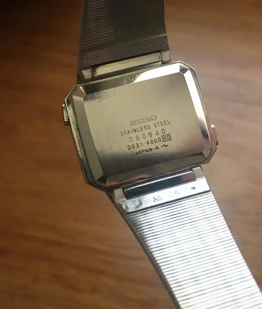 Seiko monto su módulo “Dot Display” D031H en una caja rectangular plana de 23x31 mm, que incorpora función de “Scrolling” para hora y fecha, y botón de luz para su visionado nocturno. En versiones posteriores, como la D031-401A, llevará marcado en su dial “Seiko DOT MATRIX”, que es el nick por el que se conoce a este modelo.