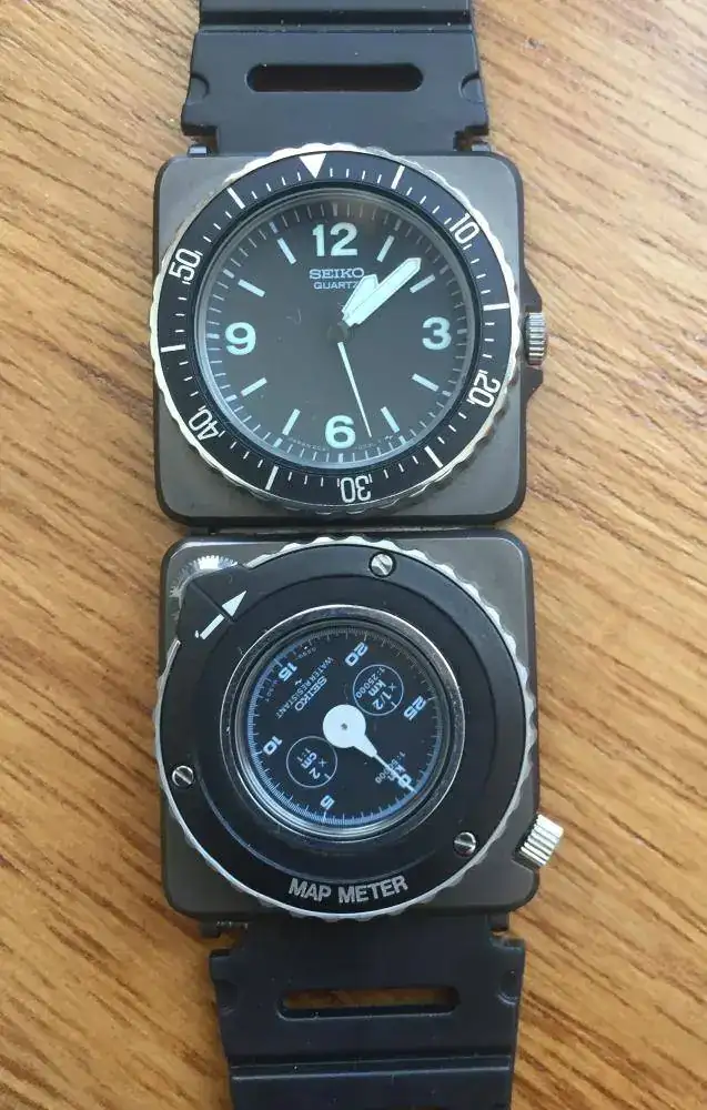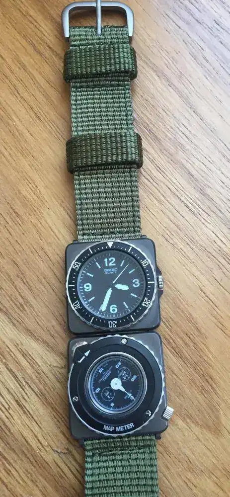 Tras el modelo inicial Seiko H558, los diseñadores de Seiko prueban algo totalmente novedoso en el Seiko SAZ 2C21-0080 “Contra” ; estrena un diseño polivalente, donde se agrupan dos cajas cuadradas de titanio de 28x28 mm, una fija con hora en formato analógico y otra en la que se posiciona un módulo extraible intercambiable, a elegir entre un módulo brujula, uno con alarma digital, o un “MapMeter” , es decir un lector de distancias en mapas como el mostrado anteriormente en la foto, donde una rueda calibrada a escala 1:50.000 permite saber las distancias exactas a la hora de leer mapas tácticos, en esta ocasión los efectuados por el INETER Nicaragüense. Esta es seguramente la función más determinante a la hora de su posible suministro a los insurgentes, pues junto a la brújula, permite de forma rápida la navegación, posicionamiento e interpretación de mapas, etc…