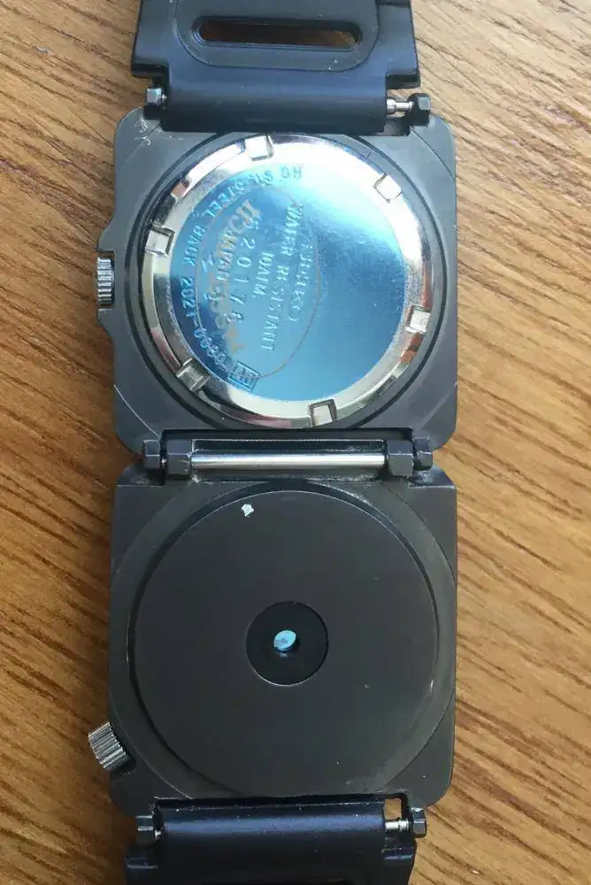 Otro aspecto interesante es el armís de metálico semirígido con acabado “Espejo” a juego con el marco exterior del dial que Seiko diseño en exclusiva par este modelo, dotando al conjunto de un aspecto muy futurista en su momento e incluso hoy en día.