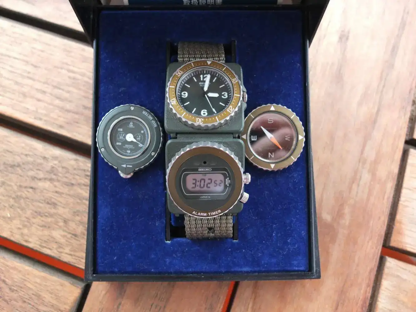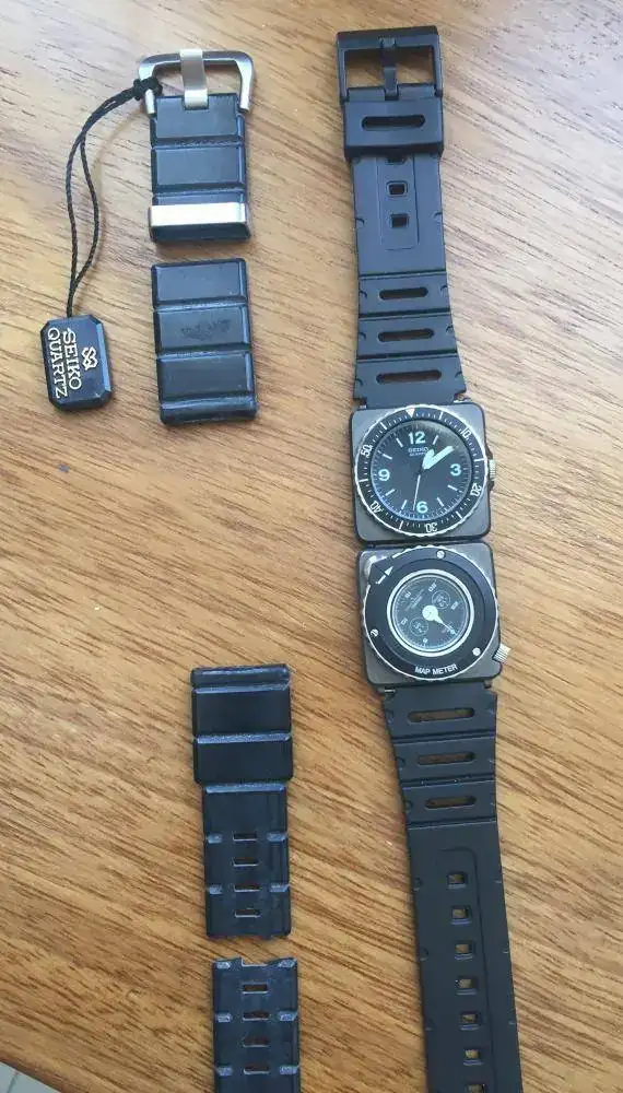 Mi unidad de estreno, todavía luce la pegatina en el modulo horario, y tiene el módulo de “MapMeter” intacto, pero perdió en estos años la caja, donde se hubicaban además los módulos de brújula y alarma. Así mismo, pese a poseer la correa original, esta se ha apelmazado de tal forma con los años que al pretender ajustarla a la muñeca, se ha partido…Esto me obligó a buscar alguna solución que no desentonara mucho. En este caso son dos las soluciones que planteo; la primera es una correa de plástico de un estilo muy similar a la original, podemos ver en la foto ambas juntas; y la otra es una correa Seiko de nylon verde oliva que mezcla la estética de ambas versiones.