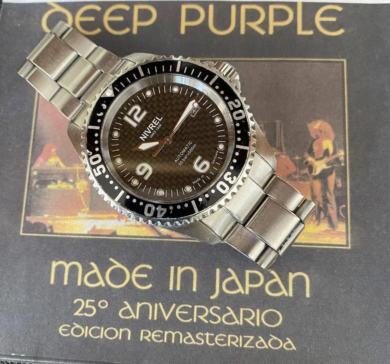 Si tengo un beater, ese es mi Nivrel Deep Ocean, un reloj alemán muy bien acabado y con un estilo submariner indiscutible. Lo adquirí al compañero xarope5 en nuestro foro y tras varios cruces de mensajes llegamos a un acuerdo. No estaba impoluto ni mucho menos, pero ya lo sabía y lo había aceptado así. Al principio no le hice mucho caso y estuvo un tiempo castigado sin salir hasta que poco a poco ganó mi corazón y empecé a sentir que estábamos hechos para estar juntos. No siempre, pero sí en momentos especiales, como cuando pulso el play y los primeros acordes de guitarra de Smoke on the water tocados por Ritchie Blackmore comienzan a sonar.