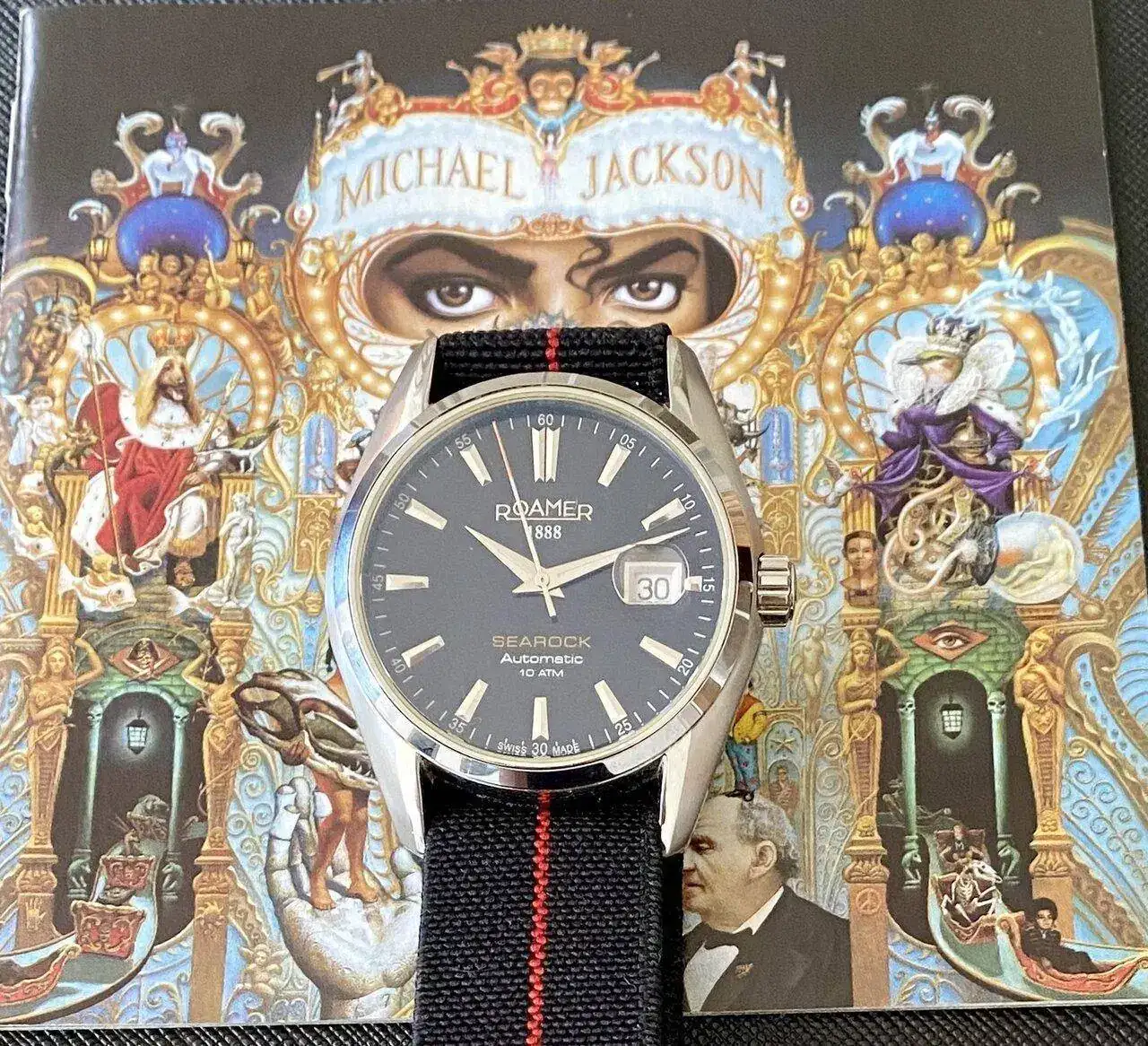El Roamer Searock vino, como tantas otras veces, de manos de Emilio. Yo no conocía la marca, ignorante que es uno, y por primera vez hubo un atisbo de duda ante el consejo de mi mentor relojero. No obstante, le hice caso y me quedé con él. Tuve que aprender a quererle y apreciarle como se merece y cada vez que salía el tema, Emilio me recordaba lo buen reloj que era. Y finalmente lo entendí. Un día me lo puse en la muñeca y lo miré con ojos de enamorado. Había sucedido el milagro. Podría decirse que The girl is mine es la perfecta canción para mi Roamer, y jugueteando con las palabras cantaría The watch is mine para recordarme a mí mismo que es una pieza poco vista, bien hecha y que rebosa calidad y buen gusto. Igual que Michael.