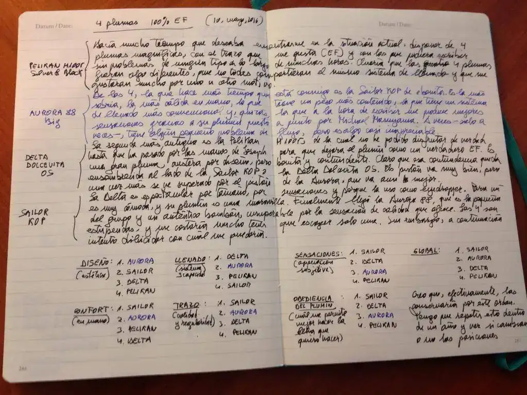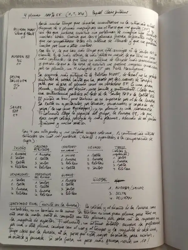 Ahora que por fin cuento con mis cuatro mejores plumas con punto EF puestas a punto y en condiciones de escribir sin parar, he hecho para mí mismo una pequeña comparación para saber con cuál me quedaría si tuviera que escoger. El resultado aparece al final de la página que adjunto. Para ser justo con las plumas y conmigo mismo, tendré que repetir la comparación dentro de un año, y ver qué pasa luego, es decir, para saber si con el paso del tiempo y el uso alguna se muestra mejor o peor de lo esperado.