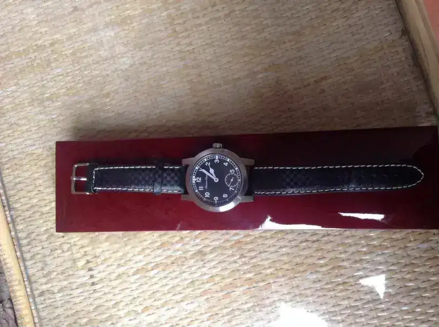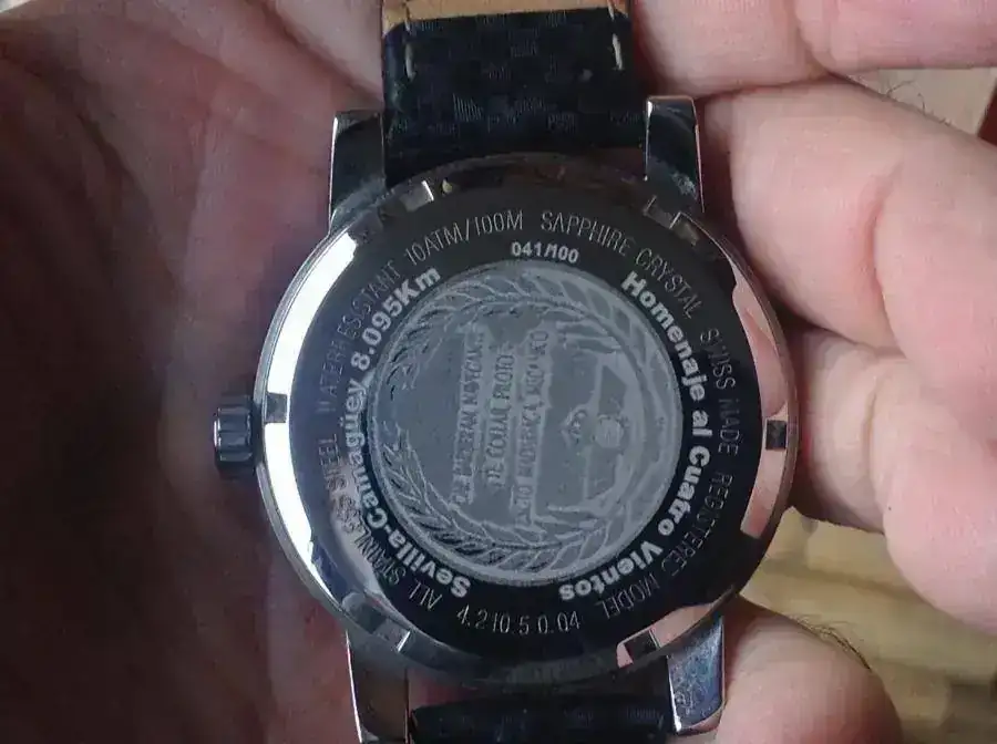Acero inox de primera, fondo grabado con fechas y no bres de tripulantes, esfera negra, indices y agujas reflectantes de luminosidad azul. 42 mm sin corona. Correa puesta por mi usada dos veces de piel y fibra de carbono. Caja preciosa de madera maciza, no pertenece al reloj si no que era de un duward de oro (marca española muy olvidada por cierto).
