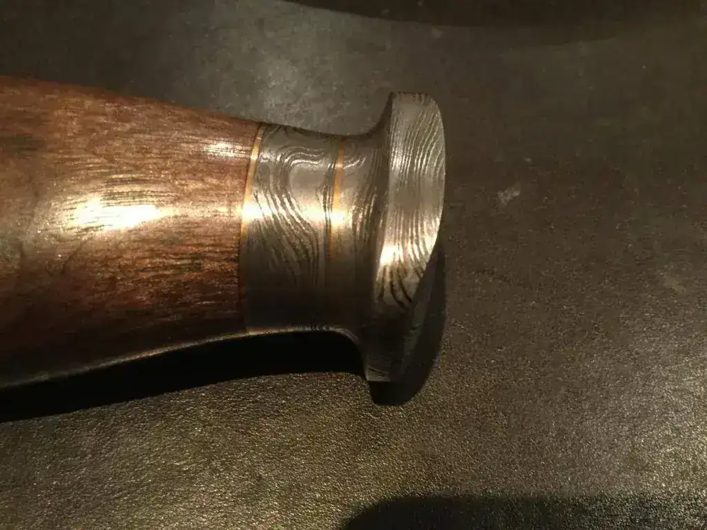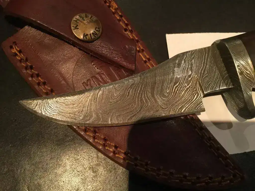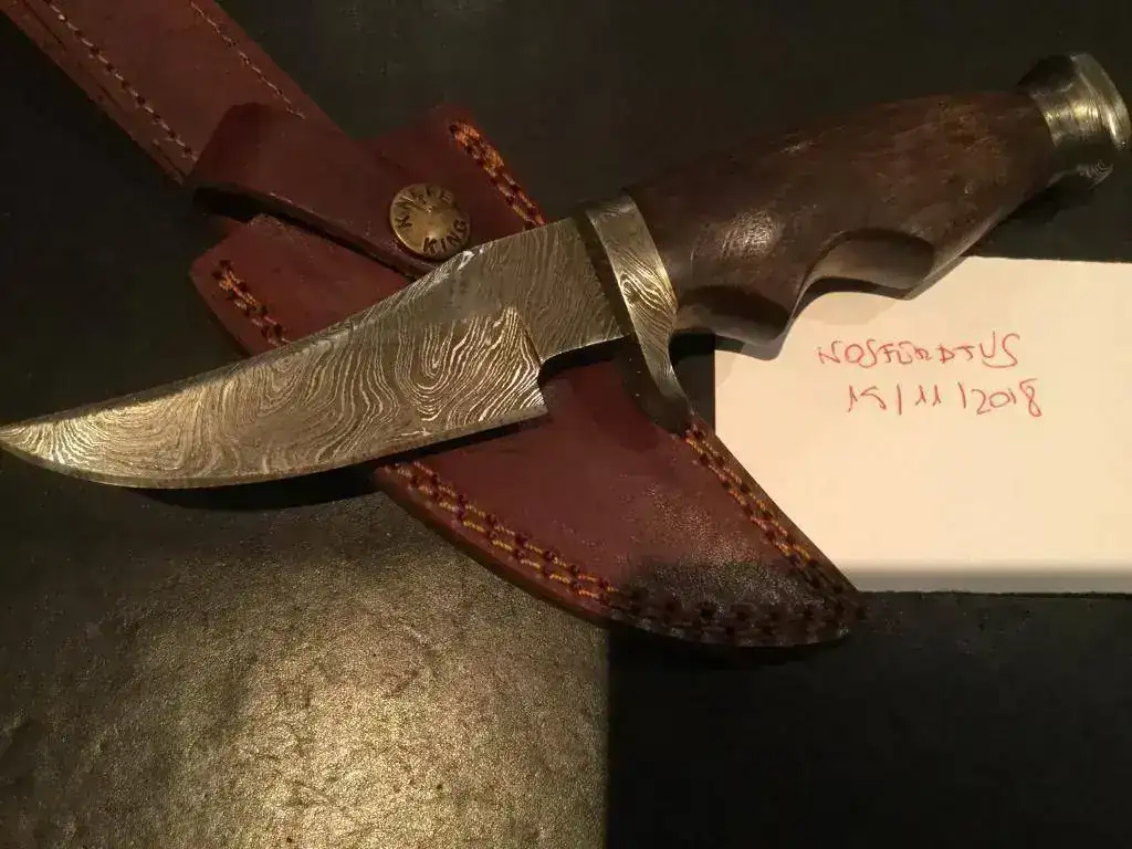 El cuchillo tiene una hoja de 11,43 cm y un mango de 12,7 cm. Mango de madera de nogal. Viene con una vaina de piel. Más de 200 capas de acero de Damasco de 15N25 y 1075 que mantiene afilado el filo en cualquier condición. El filo es afilado y resistente como una roca. Dureza 58-60 HRC en la escala de Rockwell.tanto la guarda como el extremo del mango están también fabricados en damasco.
