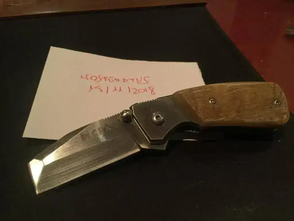Vendo dos preciosidades de mi colección, un cuchillo de caza de Damasco y madera de nogal y una mini navaja descatalogada de la marca CRKT ( Columbia River).
