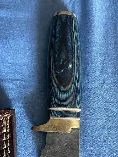 Cuchillo mango de resina prensada color azul y bronce, mide 31,5 cm.