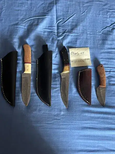 Hola, sigo sacando cosas que tengo acumuladas, se trata de unos cuchillos, para los aficionados a la cuchillería y coleccionismo, se venden 5 lotes de 3 cuchillos cada lote, son cuchillos con acero de Damasco, todos van con sus fundas, originales y sin uso.