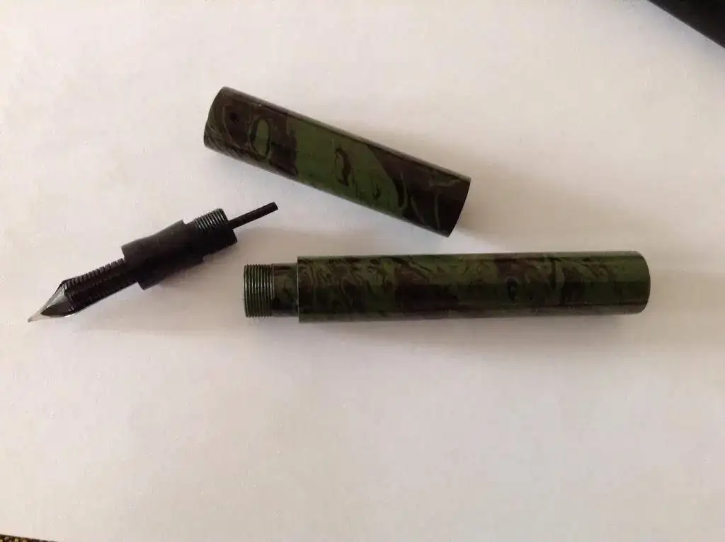 2) El cuerpo, desde la rosca mide 9 cm, pero el depósito sólo 4.5 cm: no está perforado todo el cuerpo. Menos tinta, pero también menos aire que empuje la tinta y la haga hacer burp por el plumín. Le cabe, de cualquier modo, un montón de tinta.