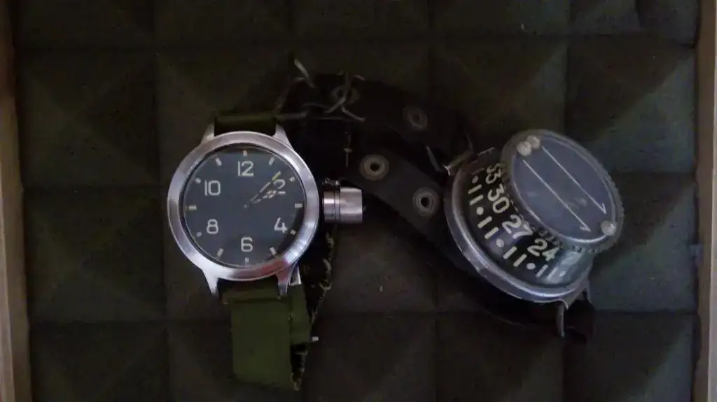 Zlatoust Vodolaz modelo 191 ChS "Saboteador", modelo que desde 1950 equipaba a los buzos de combate soviéticos. Posee el récord del mundo como reloj de pulsera más grande y pesado (60 mm y 260 gr.) y lo dio a conocer en occidente Arnold Schwarzeneger al usarlo en varias ocasiones. Yo lo guardo junto a la Brújula y profundímetro que usaban estos hombres, y creo que más que orientación el uso principal era de lastre, porque con eso amarrado a las muñecas te vas al fondo rapidito, si grande es el reloj, la brújula ya se sale.