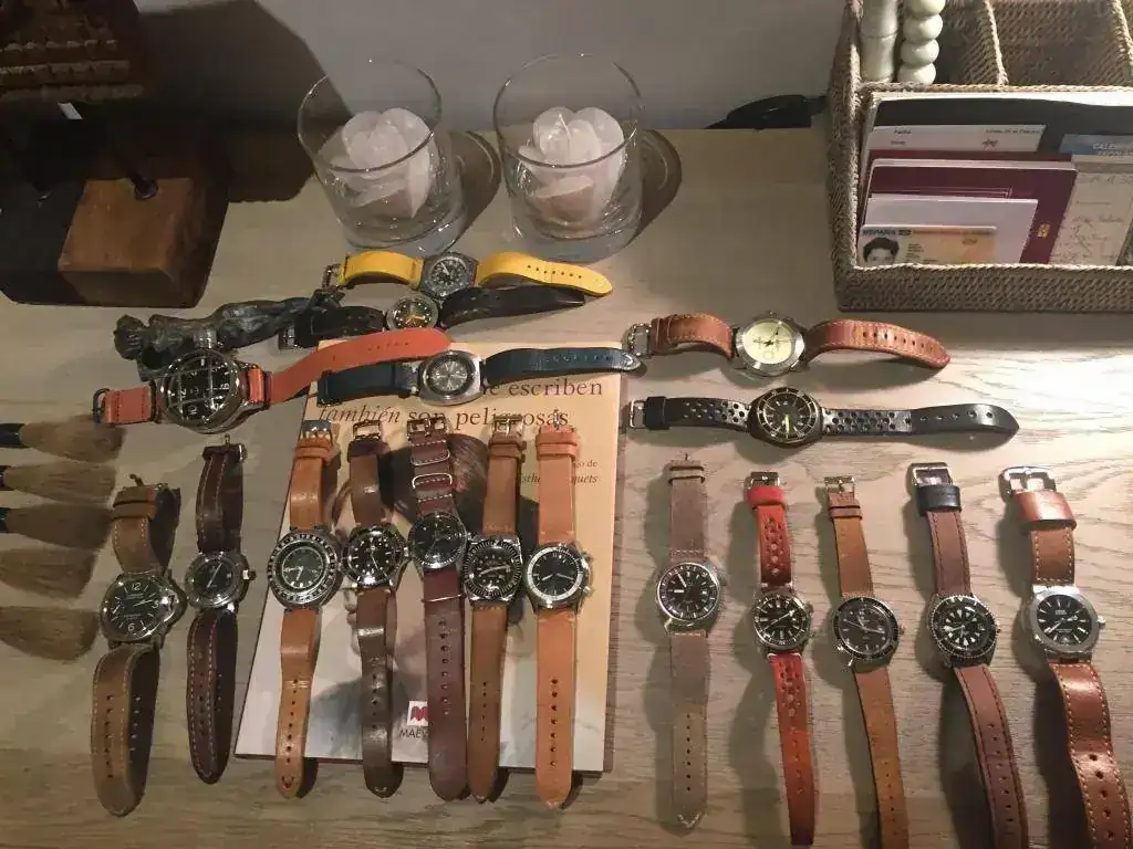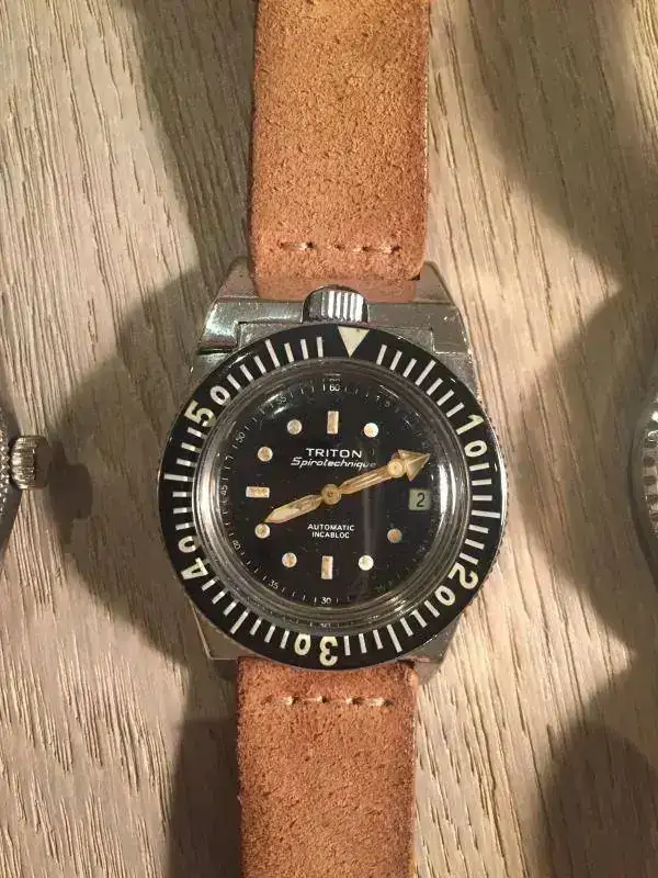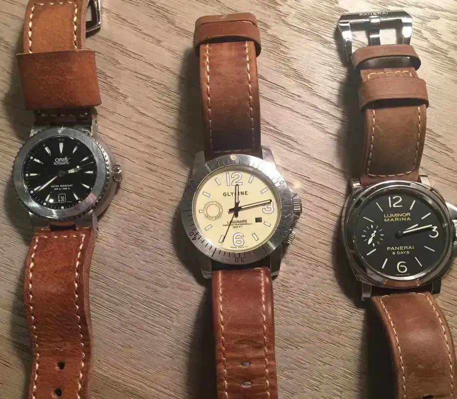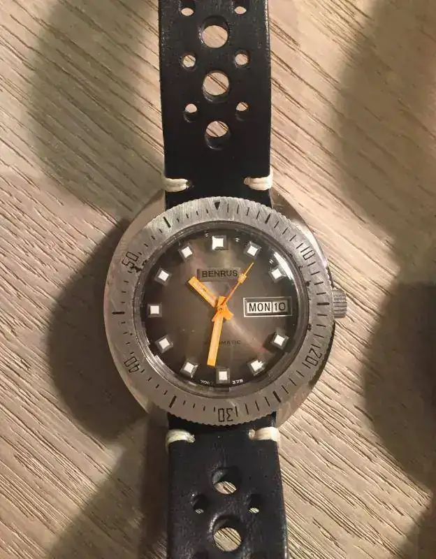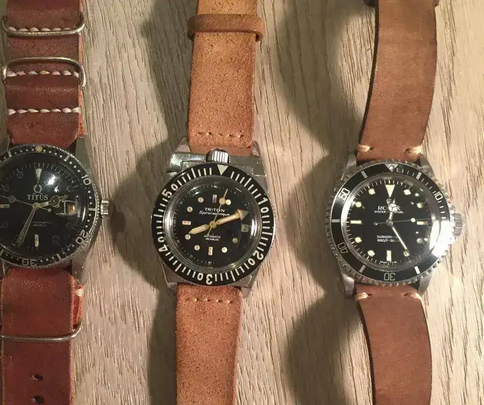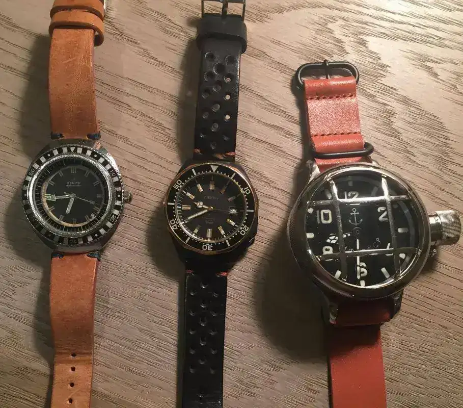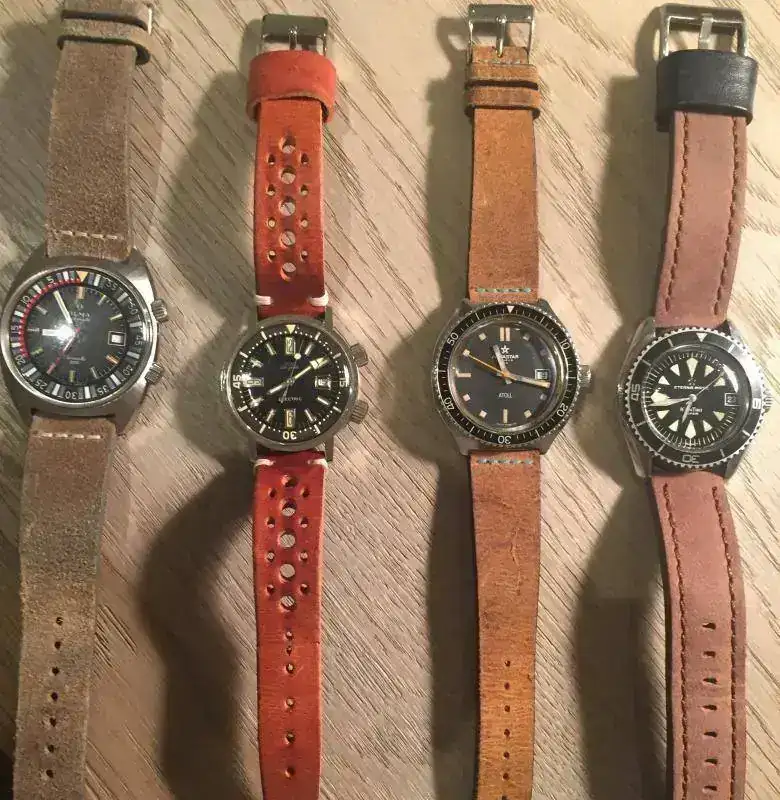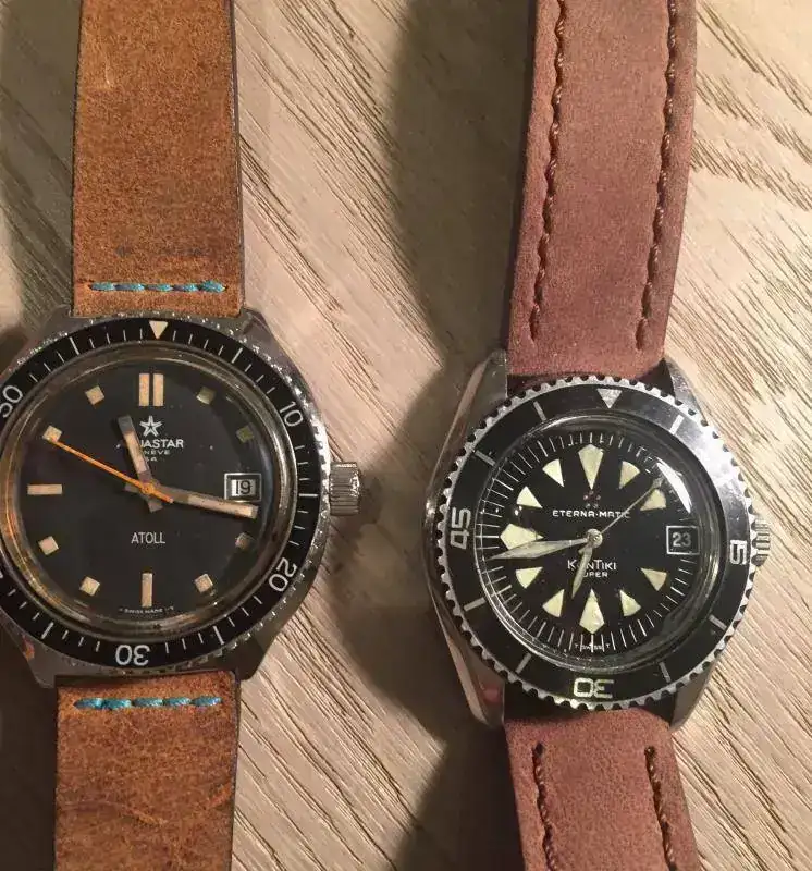 Bueno pues este hilo viene a unir dos cosas aparentemente incompatibles, como es un reloj tipo diver con una correa de cuero cuya absoluta intolerancia al agua es conocida por todos. Resulta que los que compartimos afición por los diver vintage sabemos que precisamente no podemos usarlos para aquello para lo que fueron diseñados, es decir no debemos meterlos bajo el agua, salvo revisión completa en un SAT o inconsciencia del propietario, pues pasadas varias decenas de años, la estanqueidad de muchas juntas deja mucho que desear. He aquí que ante esta pega, podemos obtener una ventaja y es la de poder usar correas que no sean específicas para el agua, como es el caso de las correas de cuero. Yo, aunque prefiero los armis y mallas de acero para mis diver, debido a una alergia al látex, retiro todas las Trophy, y muchas las sustituyo por NATOS o correas de cuero, como son los ejemplos que quiero mostrar. Creo que muchos relojes diver de aspecto rudo o rubusto, adquieren con estas correas un aspecto más compatible con el uso diario, sobre todo con cueros envejecidos, que con su patina completan la imagen vintage del conjunto. Como veréis en muchos de los ejemplos, los tonos tostados del cuero van muy bien con los diales y lúmenes envejecidos.Bueno vamos con las fotos y las presentaciones que es lo que interesa.